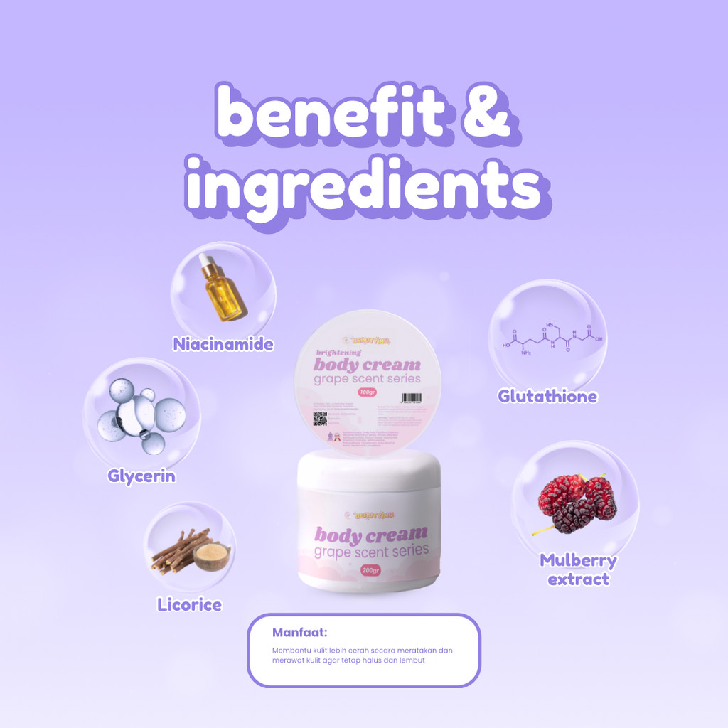 Brightening Body Cream Grape Scent adalah krim tubuh dengan aroma anggur yang lembut dan menyegarkan, diformulasikan khusus untuk membantu mencerahkan kulit secara merata sekaligus merawat kelembutan dan kelembapan kulit. Dapat digunakan setiap hari untuk hasil maksimal.