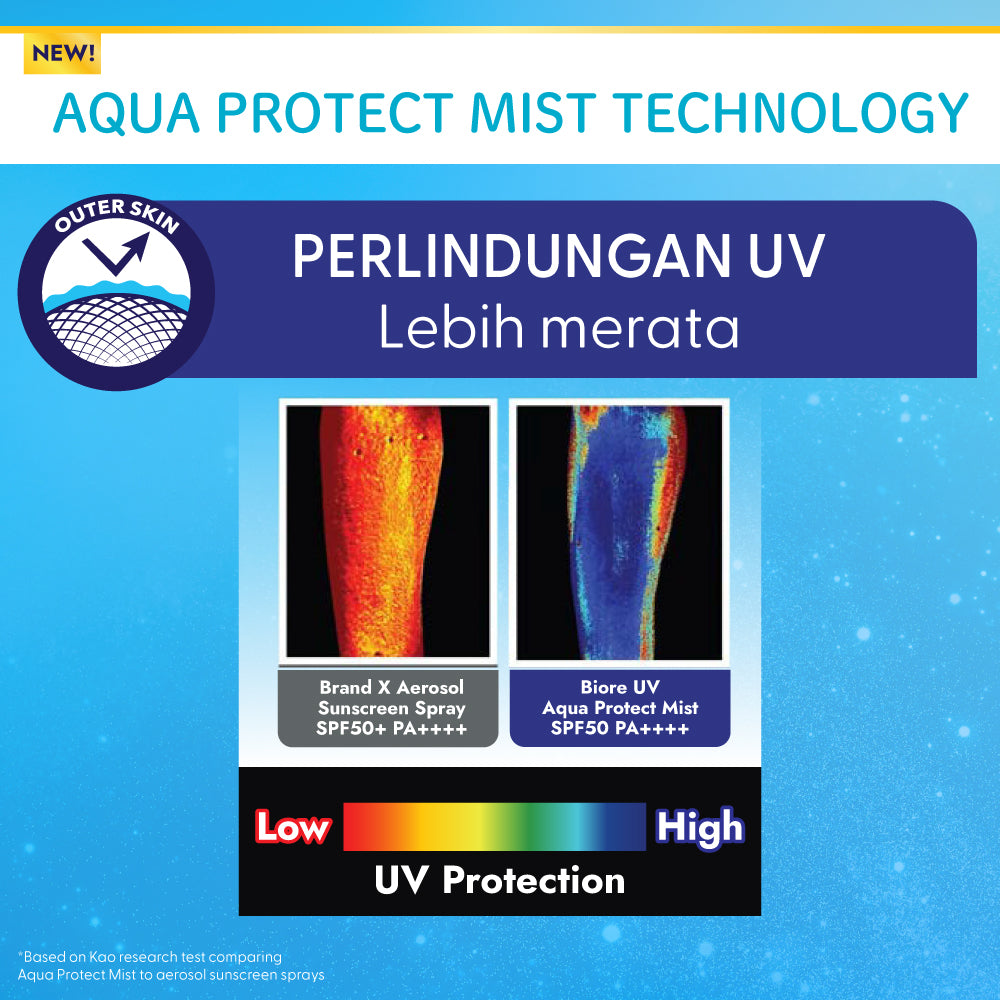 Perlindungan UV lebih merata dengan spray yang lembut, jangakauan yang luas, tidak terasa lengket, dan terasa ringan! Praktis mudah diaplikasikan kapanpun dan dimanapun.