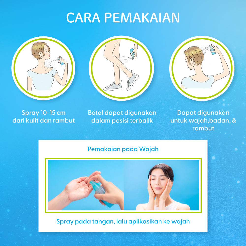 Jika ingin digunakan pada wajah dan leher, baik sebelum maupun setelah makeup, semprotkan pada telapak tangan terlebih dahulu lalu aplikasikan perlahan pada wajah dan leher.