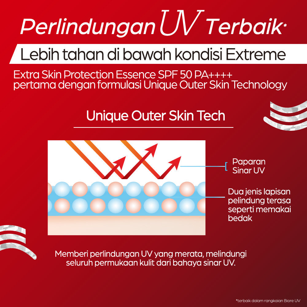 Sunscreen Extra Skin Protection Essence SPF 50+ PA++++ pertama dengan formulasi Unique Outer Skin Technology untuk perlindungan aktivitas pada kondisi yang ekstrim, dengan tingkat suhu dan kelembaban yang tinggi .