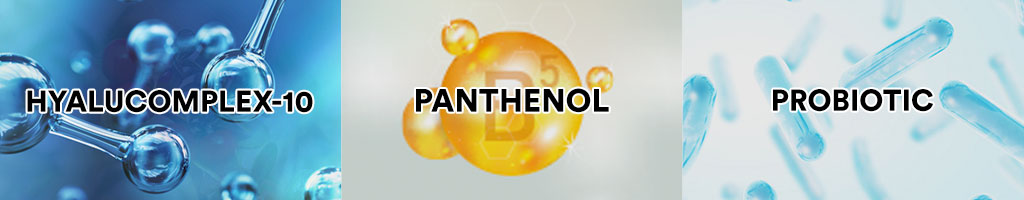 - HyaluComplex-10: kombinasi dari 10 jenis molekul Hyaluron “low to middle weight molecule” yang dapat meningkatkan dan mempertahankan level hidrasi pada lapisan kulit yang berbeda sehingga dapat menjaga kelembapan wajah sepanjang hari