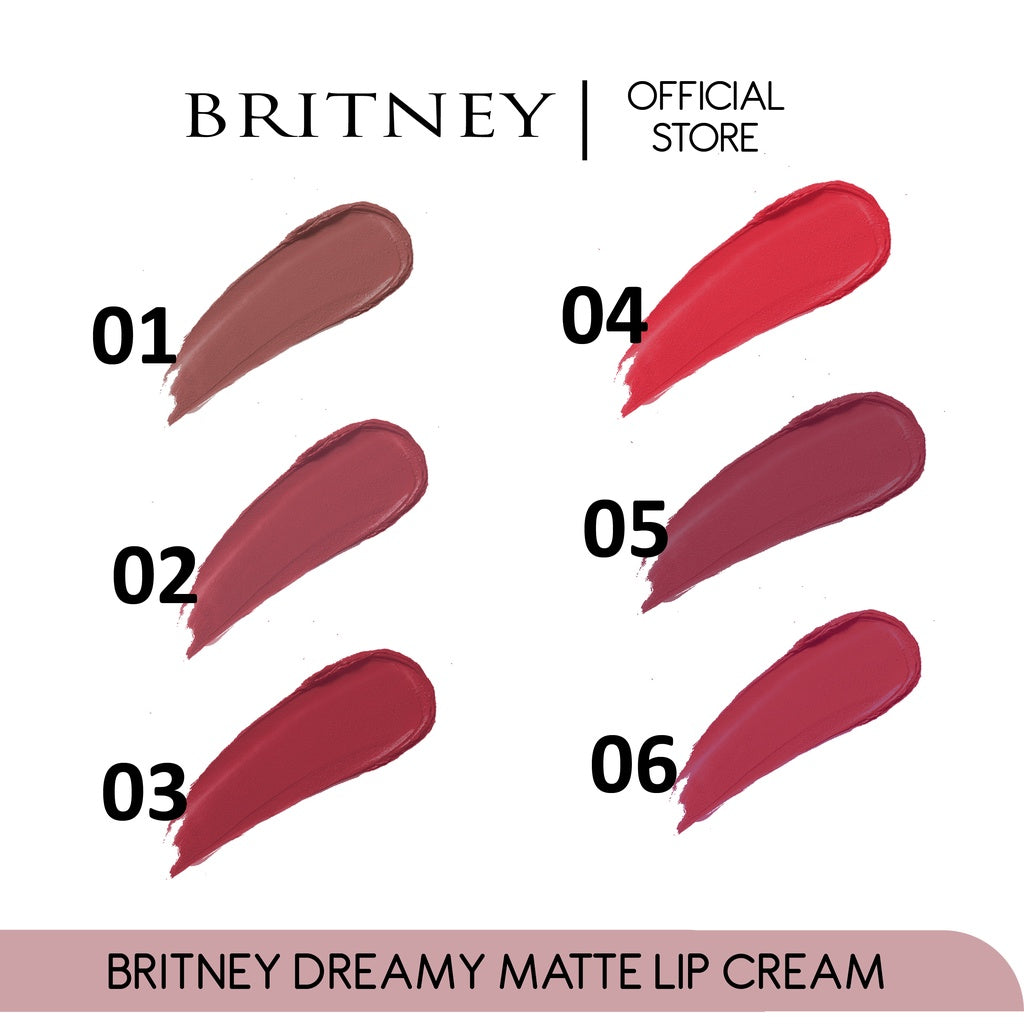 *Britney Dreamy Matte Lip Cream hadir dengan formula yang terbaru mengandung vitamin E dan Argan Oil yang berfungsi sebagai antioxidant sehingga dapat membantu menjaga kelembaban alami bibir hingga tampak memukau dan menutrisi bibir untuk tetap lembab secara alami. Sapuan warna yang indah dan pigmented membuat bibir terlihat lebih menarik dan membuat percaya diri lebih lama. Tersedia dalam 6 pilihan warna yang cocok dalam setiap kesempatan (casual, formal, party, dan tampilan dengan hijab).