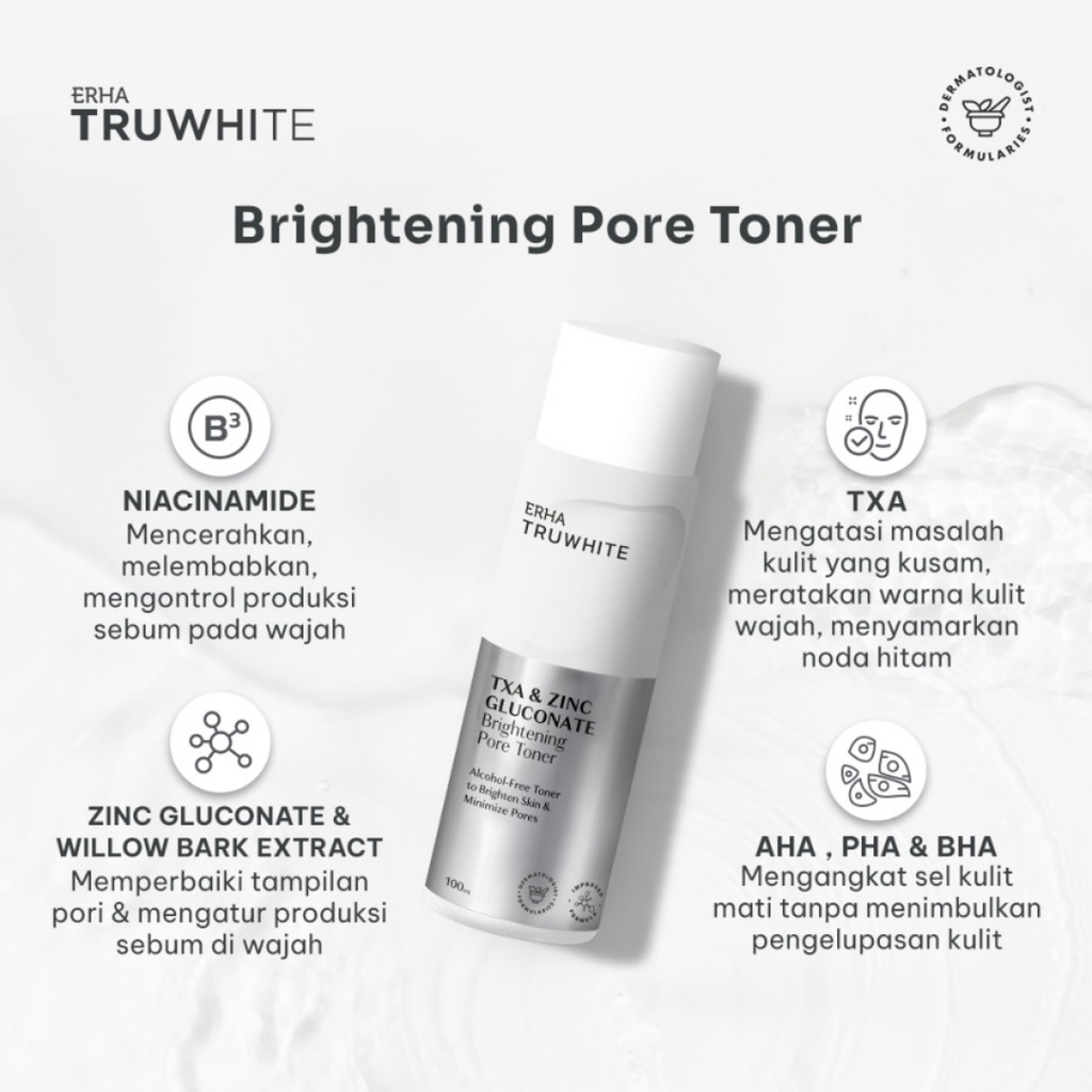 ERHA Truwhite Brightening Pore Toner 100 mL with 2% Zinc Gluconate, Tranexamic Acid & Niacinamide - Toner Pencerah Wajah yang Kuat serta Efektif Kecilkan & Samarkan Pori dengan AHA PHA dan Alkohol Free