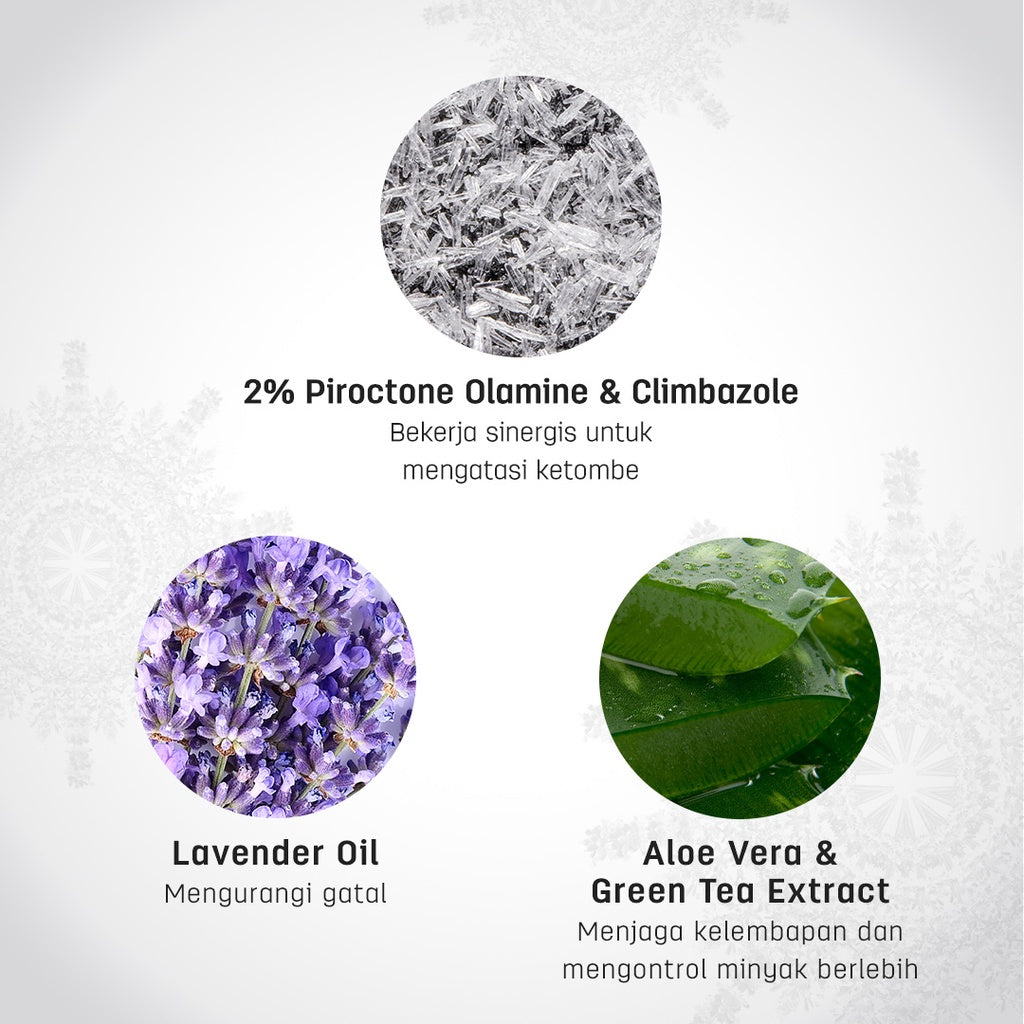 Diformulasikan dengan kandungan Climbazole & Piroctone Olamine yang sangat efektif untuk mengatasi ketombe hingga dermatitis seboroik dan bau pada kulit kepala. Juga terdapat Menthol yang dapat memberikan efek sejuk dan nyaman di kulit kepala.