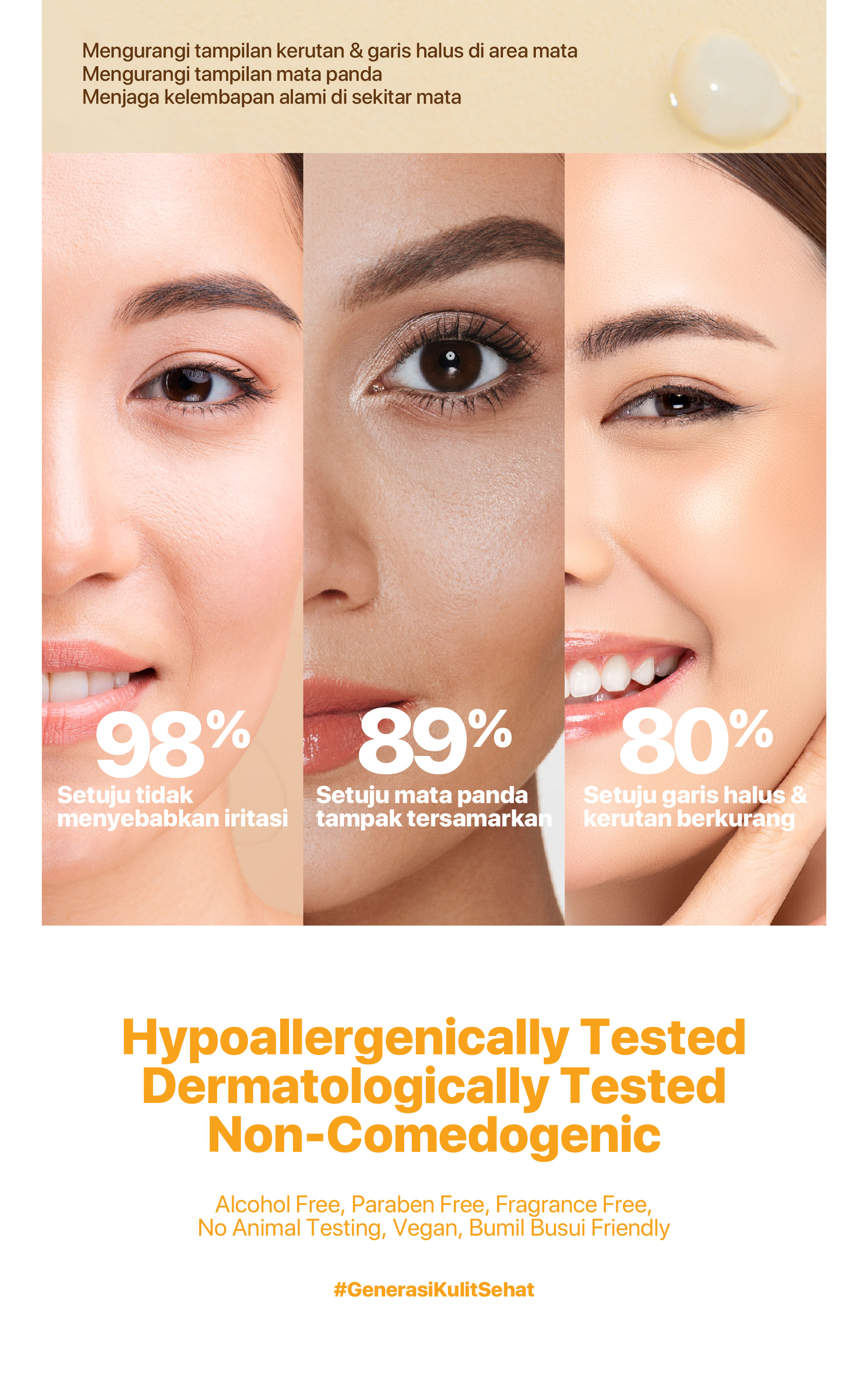Perawatan mata anti kerutan alami pertama yang telah melalui TRIPLE TESTED FORMULATION (Dermatologically,