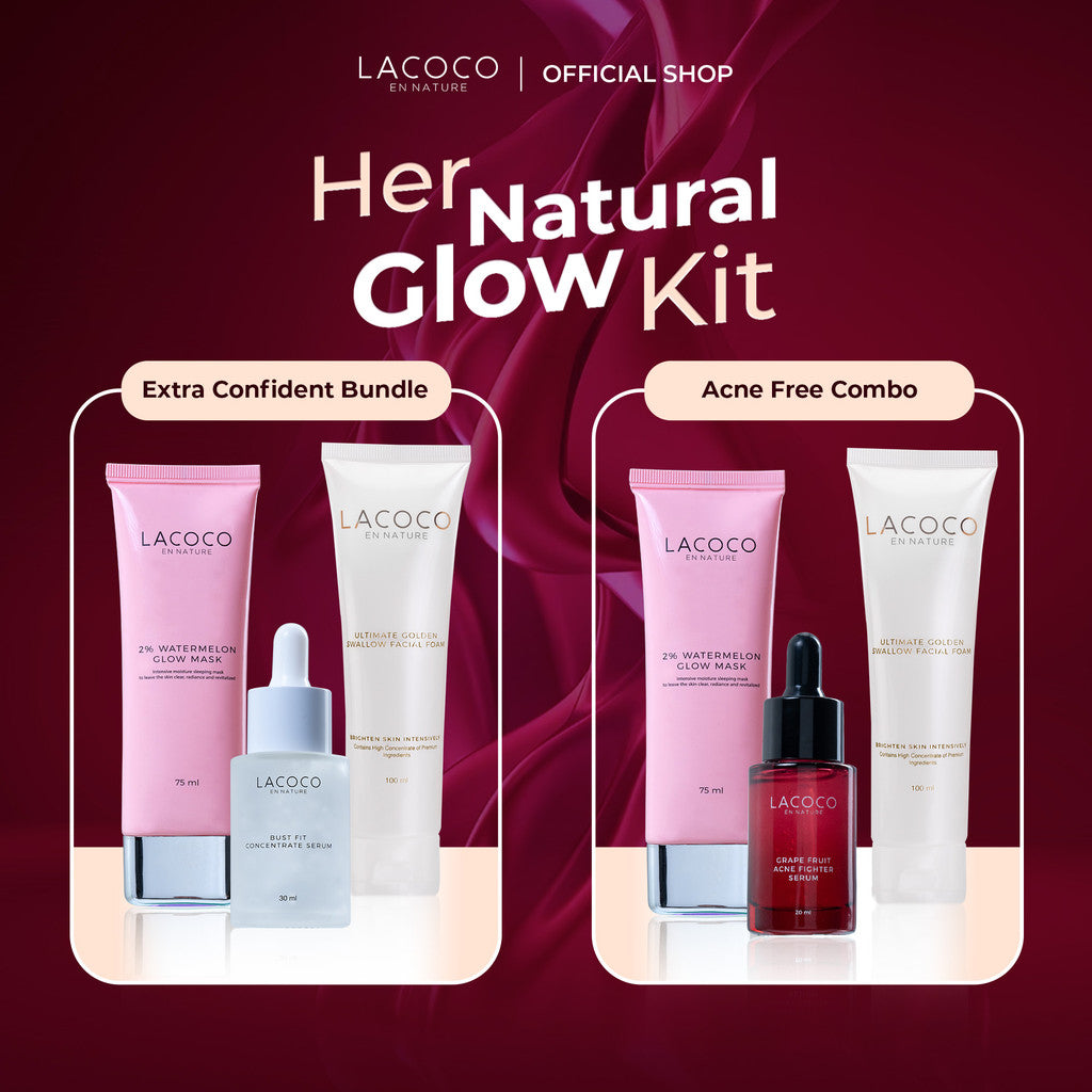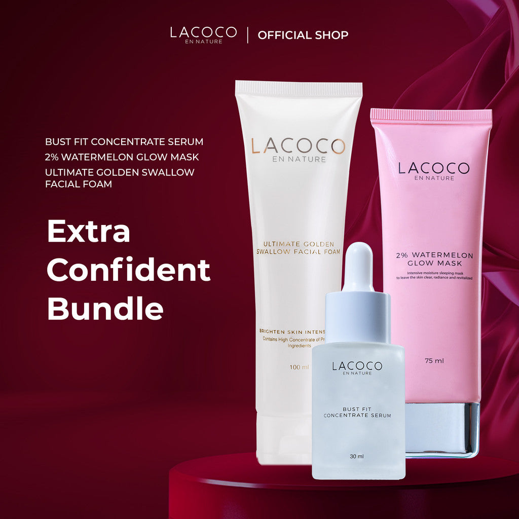 Extra Confident Bundle berisi 2% Watermelon Glow Mask sebagai masker glowing yang bisa kamu pakai sebelum tidur; Ultimate Golden Swallow Facial Foam sebagai sabun wajah yang membersihkan dengan lembut; dan Bust Fit Concentrate Serum sebagai masker khusus PD agar tampak plumpy.