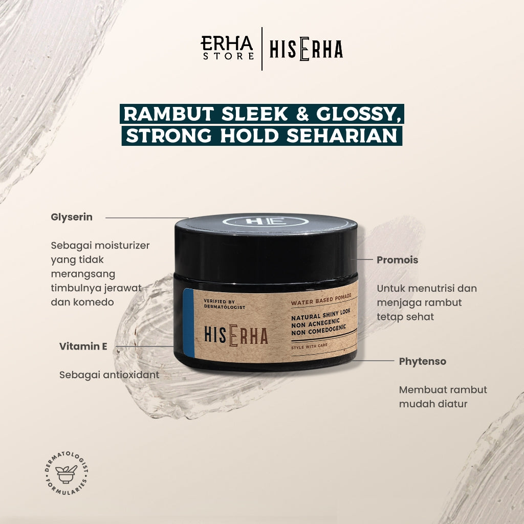 HIS ERHA Waterbased Pomade 35g - Hair Styling Pria Untuk Hasil Sleek, Strong Hold, Mudah Dicuci, Aman & Tidak Menyebabkan Timbulnya Jerawat & Komedo, Wangi Segar Maskulin, Verified by Dermatologist, Glyserin, Vitamin E, Promois, Phytenso