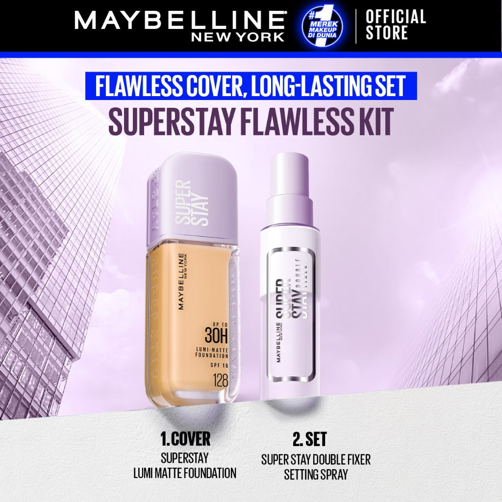 MAYBELLINE OFFICIAL Superstay Unbreakable Set - Superstay Setting Spray, Flex Powder Foundation, Lumi Matte Foundation Shade 111 Transferproof Ringan Tahan Air Waterproof