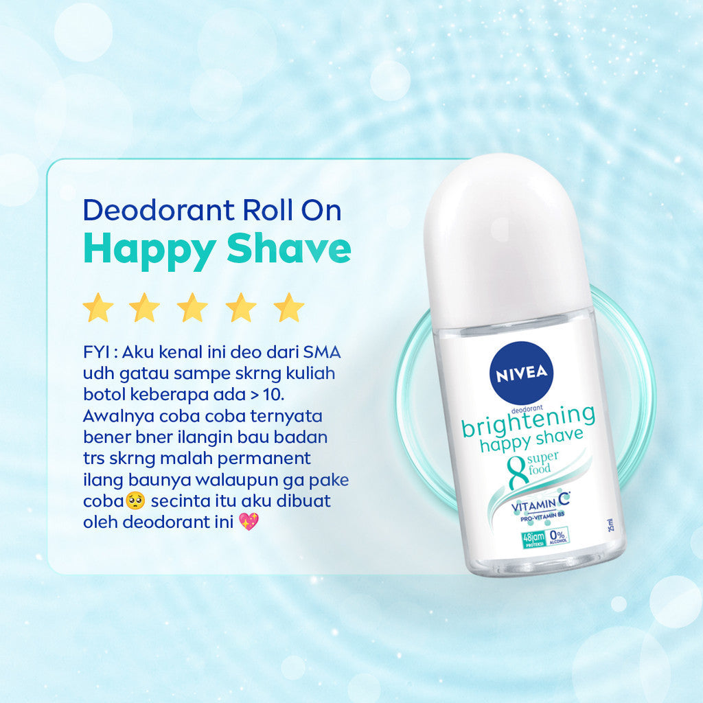 NIVEA Deodorant Roll On Brightening Happy Shave 25ml - Deodoran wanita mencerahkan mencerahkan brightening ketiak halus mulus mengurangi iritasi setelah bercukur - Vitamin C, Pro-vitamin B5, Aloe vera, 0% alkohol cocok semua jenis kulit