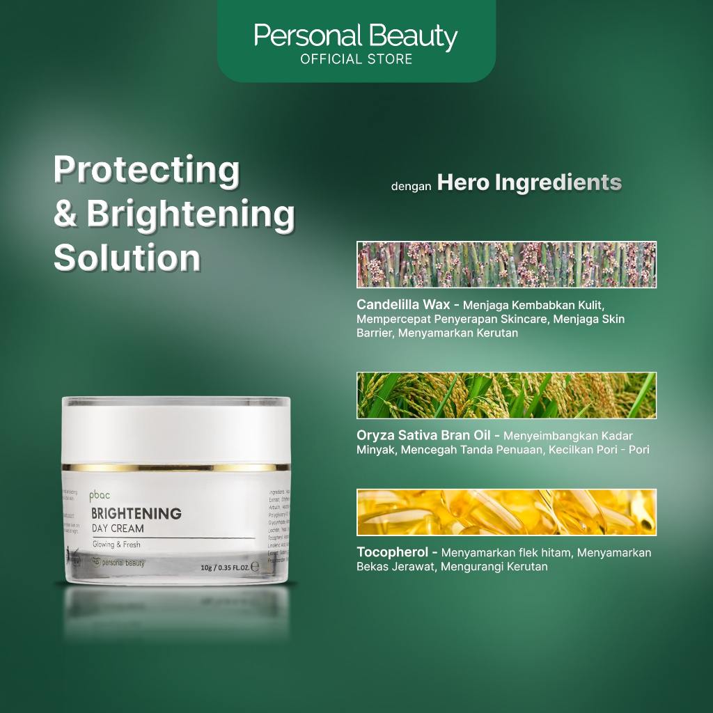 Personal Beauty Brightening Day Cream Glowing & Fresh merupakan cream siang dengan mengandung beberapa bahan yang bertujuan untuk melembabkan, melembutkan dan memberikan efek pencerahan pada kulit sehingga kulit terlihat lebih Glowing dan Fresh.