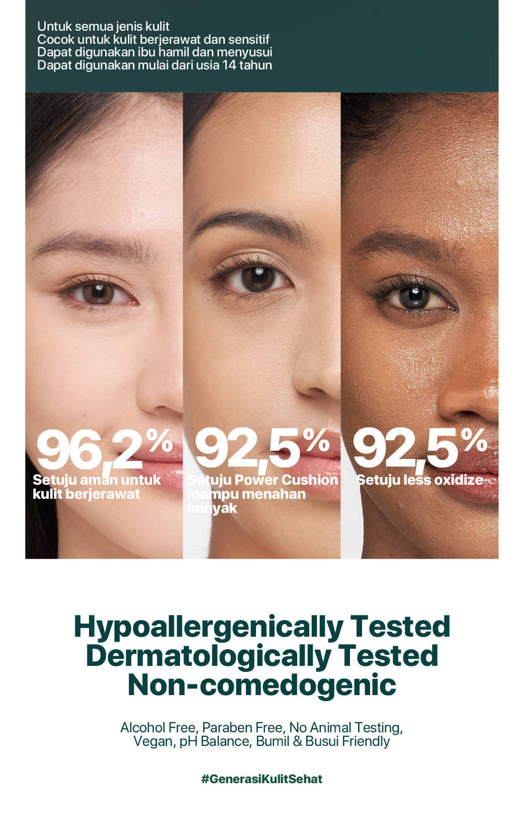 Skincare-infused cushion dengan kandungan Organic Centella Asiatica & Metagram Patented Technology untuk wajah bebas kilap hingga 12 jam. Full coverage finish namun terasa ringan saat digunakan, mampu menyamarkan 5 permasalahan kulit (jerawat, pori-pori, freckles, bekas jerawat, kemerahan) dan merawat kulit berjerawat.