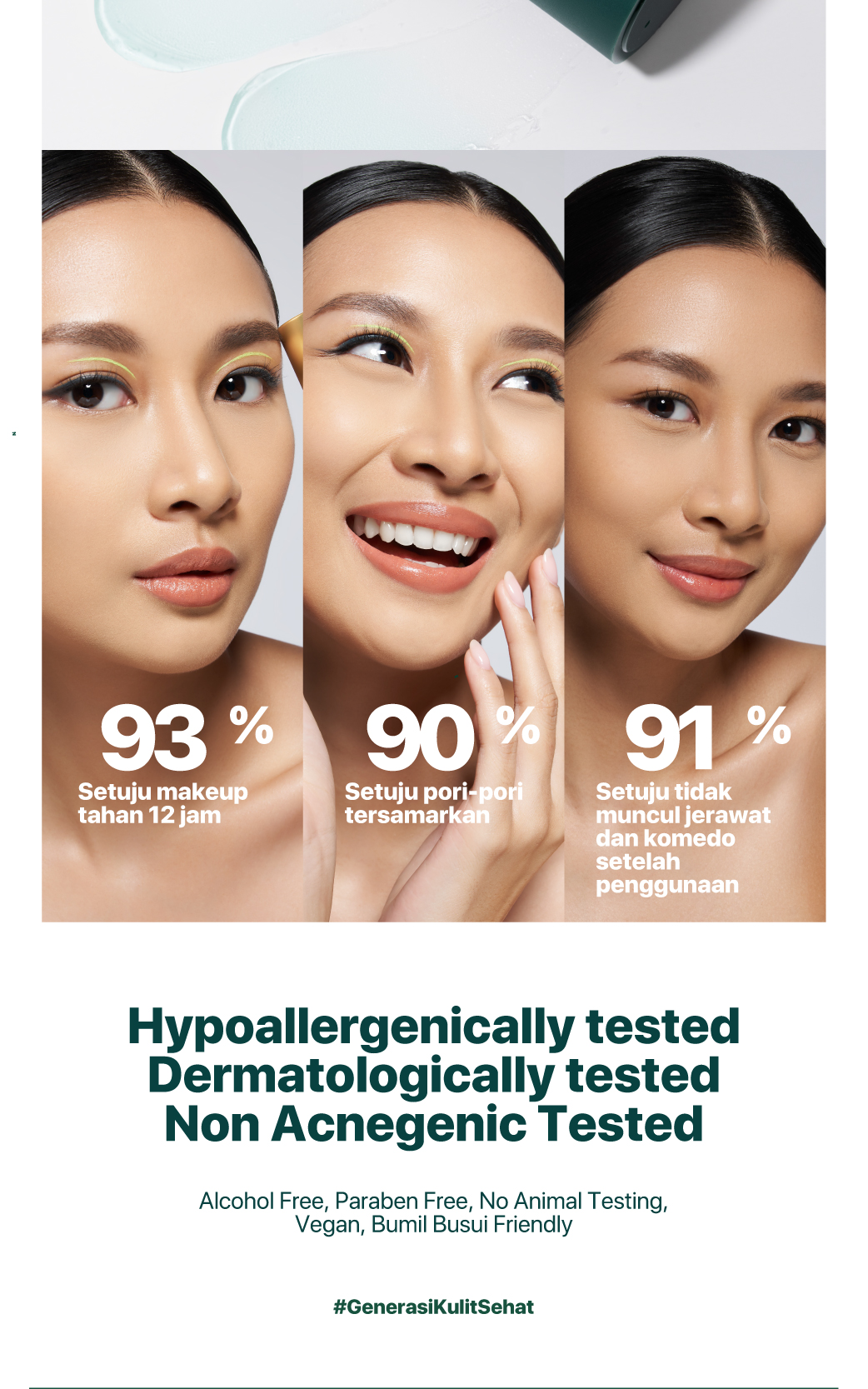 BPOM, Hypoallergenic, Non-acnegenic, Dermatologically Tested, Non-comedogenic, Fragrance Free, Alcohol Free, Paraben Free, Vegan, SLS Free, No Animal Testing, EU Allergen Free, Minimal Ingredients.