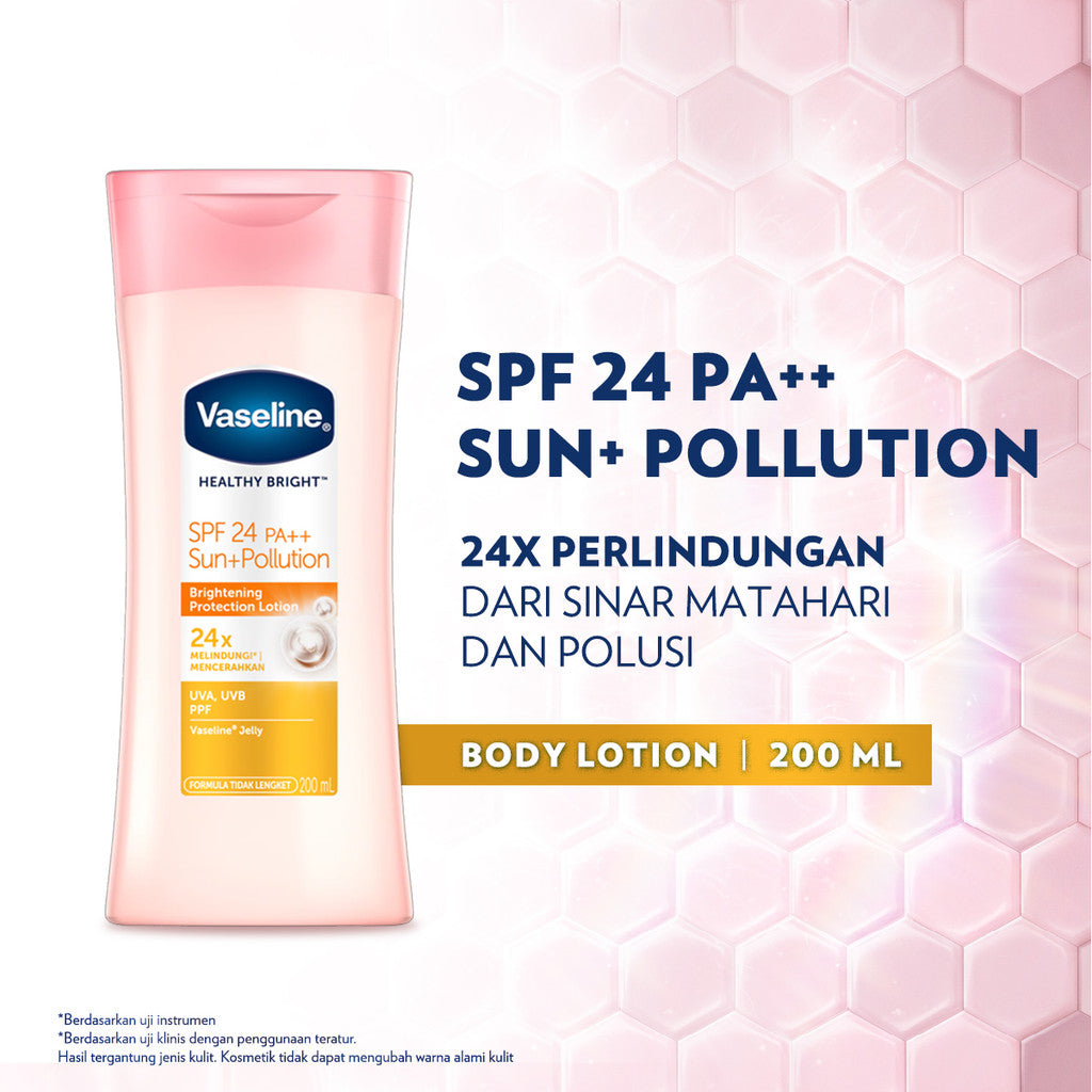 Vaseline Lotion Healthy Bright SPF24 PA++ 200ml Melindungi dan menjaga kulit tetap cerah merata, meskipun berada di bawah sinar matahari. Diperkaya SPF 24 dan PA++ untuk perlindungan dari sinar UVA dan UVB yang dapat menyebabkan penggelapan kulit, warna kulit tidak merata, dan penuaan dini. Mengandung Vitamin B3 alami, yang membantu kulit tampak lebih cerah dengan cara menghambat produksi melanin.