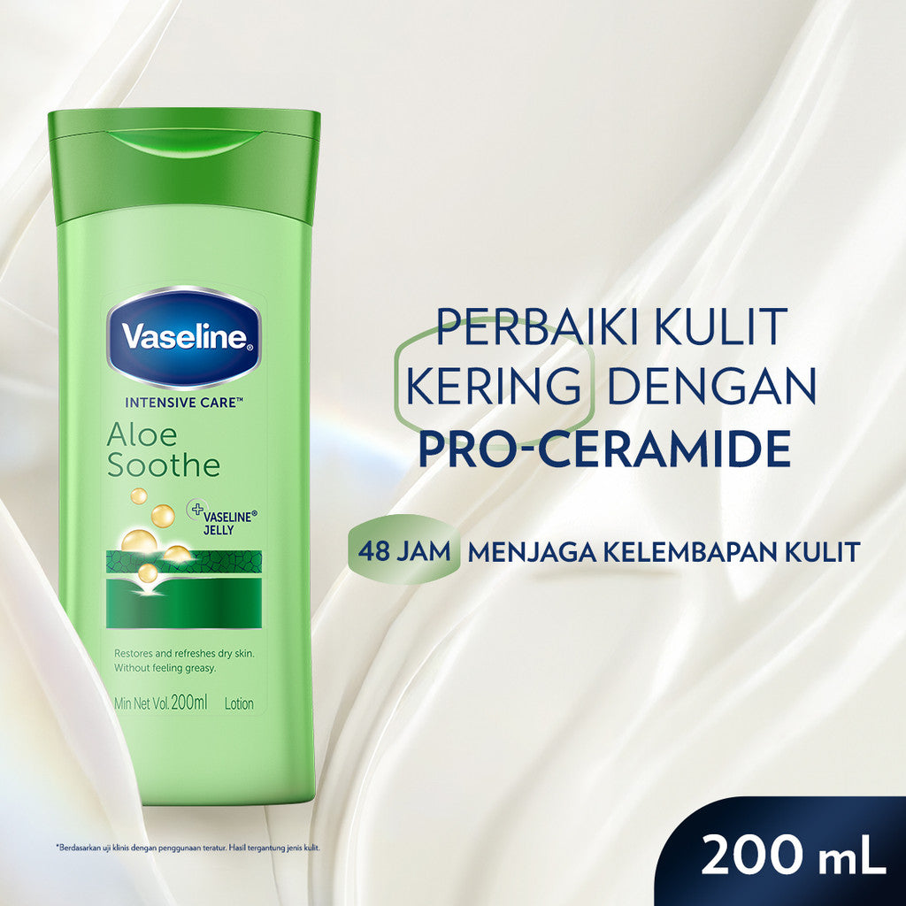 Vaseline� Intensive Care� Aloe Soothe dengan pure aloe extract diperkaya formula yang menyegarkan, cepat meresap, dan tidak lengket. Hasilnya adalah lotion yang mengurangi ketidaknyamanan akibat kulit kering dan iritasi, dan membuat kulit terasa lembab dari dalam dan tetap sehat.