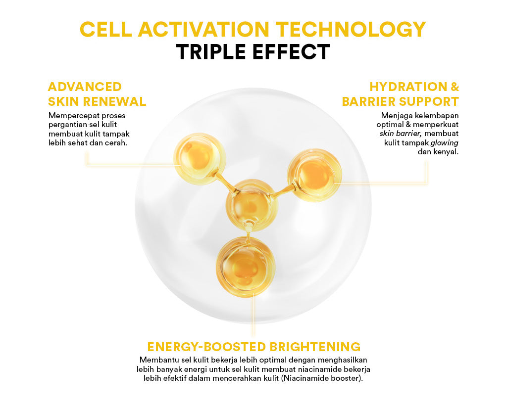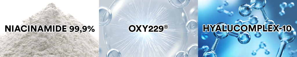 - Oxy229: meningkatkan kemampuan sel kulit untuk meningkatkan supply oksigen sehingga menghasilkan energi untuk tampilan kulit lebih sehat, cerah, dan glowing