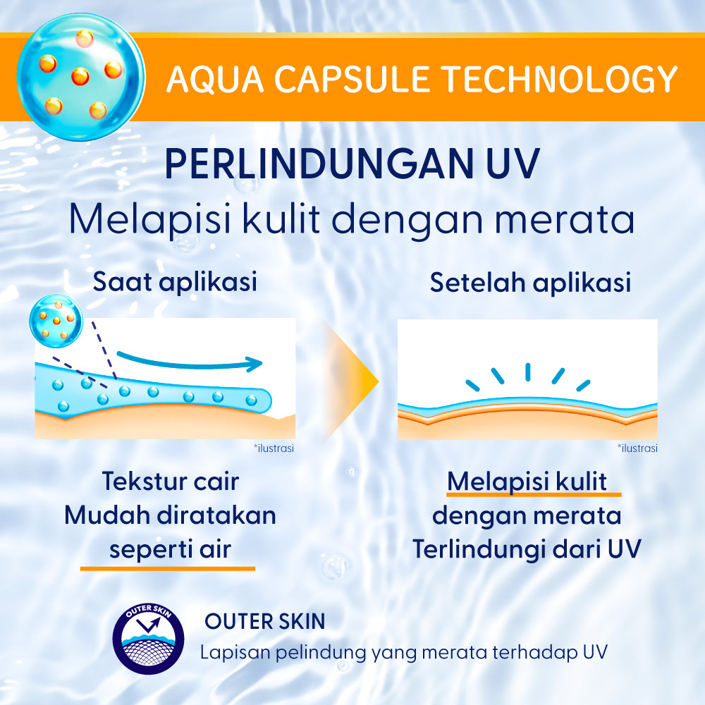 Lotion pertama dengan AQUA CAPSULE TECHNOLOGY yang memberikan perlindungan UV terenkapsulasi dengan melapisi kulit secara merata. Dengan Outer Skin Technology yang memberikan perlindungan dari sinar UVA & UVB secara maksimal membuatnya tekstur lebih ringan, kulit tampak glowing, tanpa whitecast, dan terasa lembap sehingga dapat digunakan sebagai base makeup.