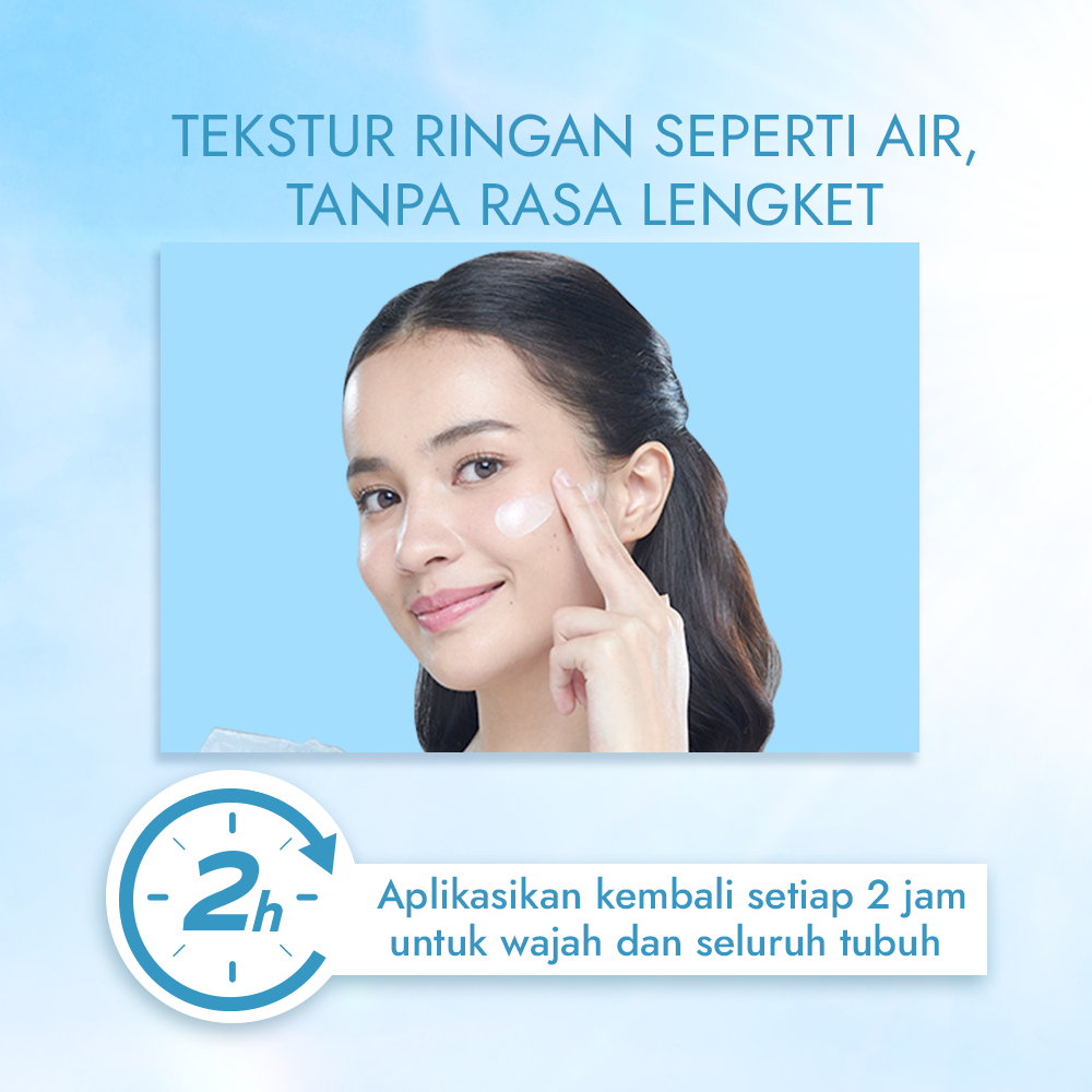 - Biore's Unique Outer Skin Technology memberikan perlindungan merata di seluruh permukaan kulit terhadap UV yang terasa nyaman dan ringan seperti air.