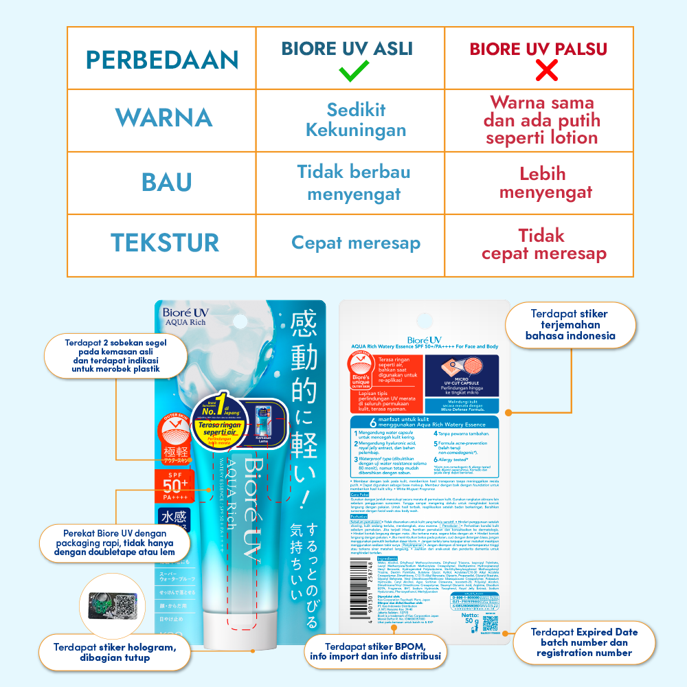 Biore UV Aqua Rich Watery Gel Sunscreen Skin Care SPF 50+ PA++++ merupakan salah satu varian sunscreen Biore UV Series dengan The 1st Double UV Filter yang memberikan perlindungan UVA UVB secara maksimal, rapat hingga ke celah kulit.
