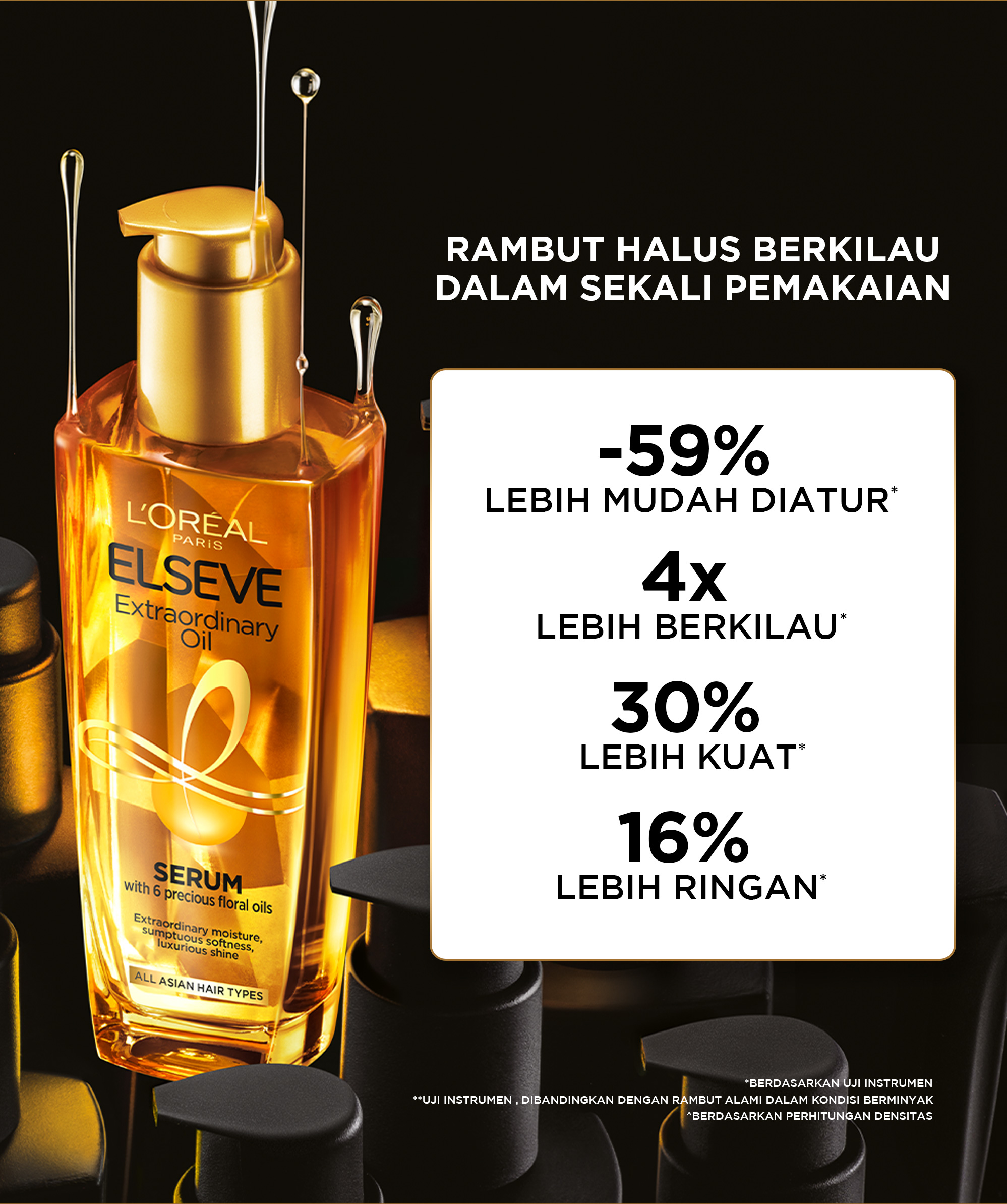 • L'Oreal Paris Extraordinary Oil Gold adalah serum perawatan rambut intensif. Rambut akan secara intensif ternutrisi, dan terlindungi, dan memberikan hasil rambut yang halus, lembut, tampak berkilau, tanpa memberikan hasil akhir yang lepek secara seketika.