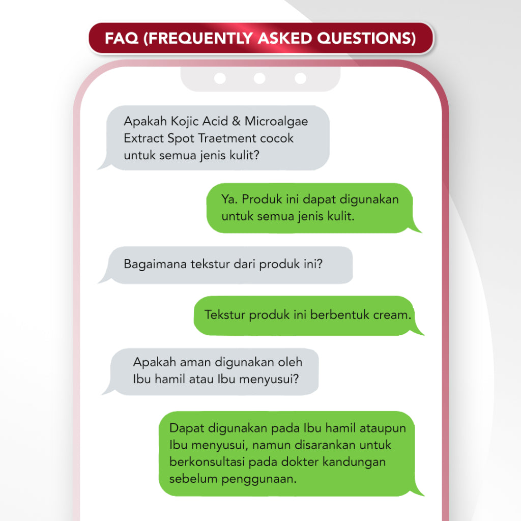 Krim khusus dengan kandungan Kojic Acid dan Microalgae Extract yang dapat membantu menyamarkan flek hitam dan meratakan warna kulit sekitarnya.