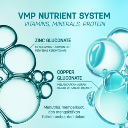 - Ekstrak Cucurbita Pepo Seed, ekstrak Ginseng dan Niacinamide yang berfungsi melancarkan mikrosirkulasi darah pada kulit kepala serta mengoptimalkan penyerapan nutrisi vitamin dan mineral, sehingga efektif merangsang pertumbuhan rambut baru sekaligus memperbaiki kualitas rambut.