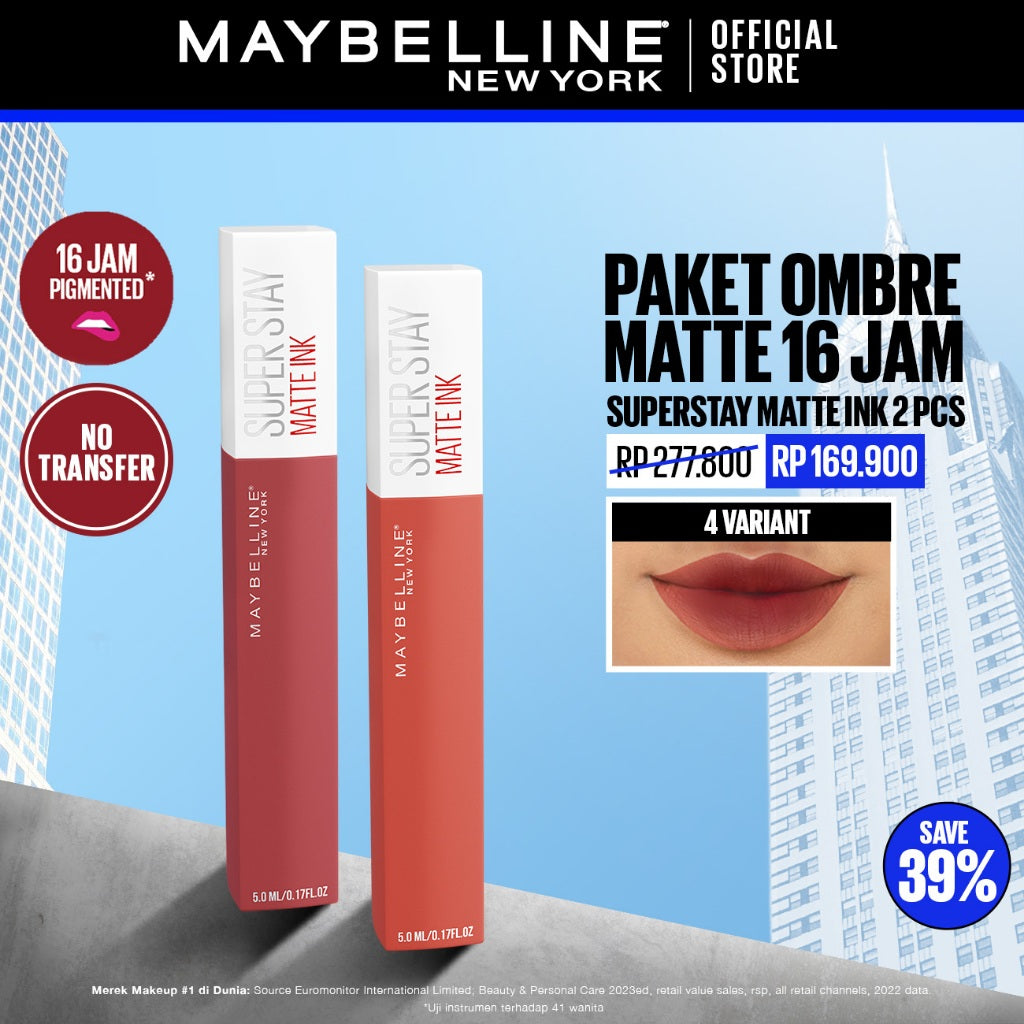 MAYBELLINE OFFICIAL Superstay Matte Ink adalah lip cream dengan 41+ pilihan warna yang intens dan pigmentasi tinggi, ampuh menutup bibir gelap, transferproof dan tahan lama hingga 16 jam!