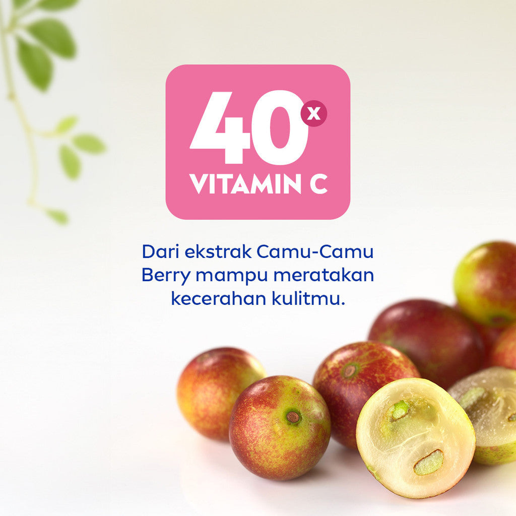 - 40x* Vitamin C dari 8 Super Foods (Semangka, peach, acerola cherry, camu-camu, jeruk, alpukat, green tea, lemon) membantu menutrisi kulit