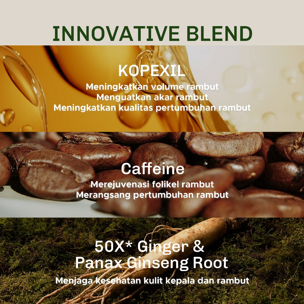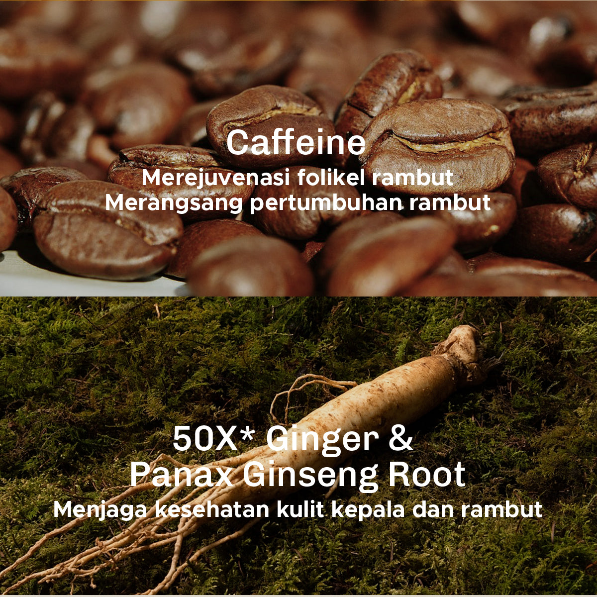 Mengandung Gingseng, jahe dan kafein yang dapat membantu meningkatkan metabolisme sel kulit kepala untuk mempercepat pertumbuhan rambut secara efektif