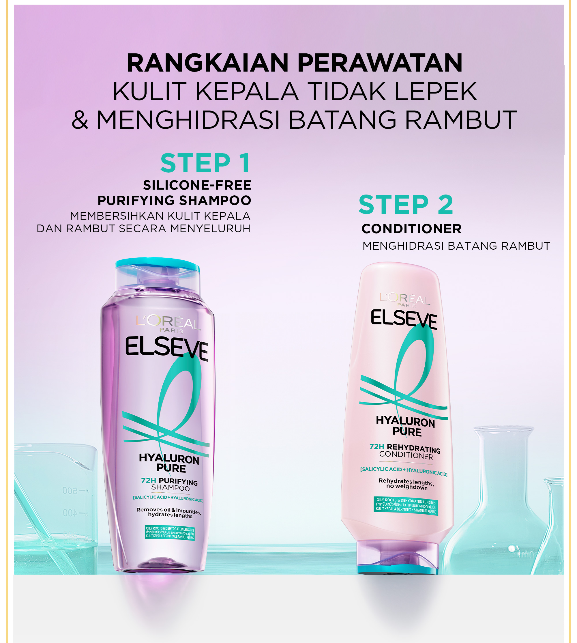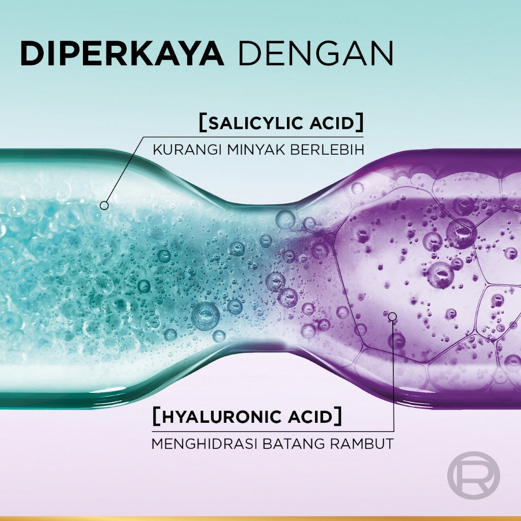 • L'Oréal Paris Hyaluron Pure 72H* Purifying Shampoo, 72Jam Kurangi Produksi Minyak Berlebih. Shampoo ini menyeimbangkan tingkat kelembapan rambut secara ideal untuk rambut yang terasa lembut dan berkilau. Diperkaya dengan [Hyaluronic acid] + [Salicylic acid] diformulasikan secara khusus untuk membersihkan kulit kepala secara menyeluruh dari minyak dan kotoran, sekaligus menghidrasi batang rambut secara mendalam, menutrisi dari kulit kepala hingga ujung rambut. Rasakan kesegaran dan kilau alami yang tahan lama!