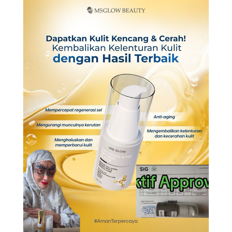 MS GLOW Encapsulated Retinol Elixir diperkaya dengan Encapsulated Retinol 0,5%, 0,05 % Retinal, Bakuchiol, Ceramide, dan Peptide
