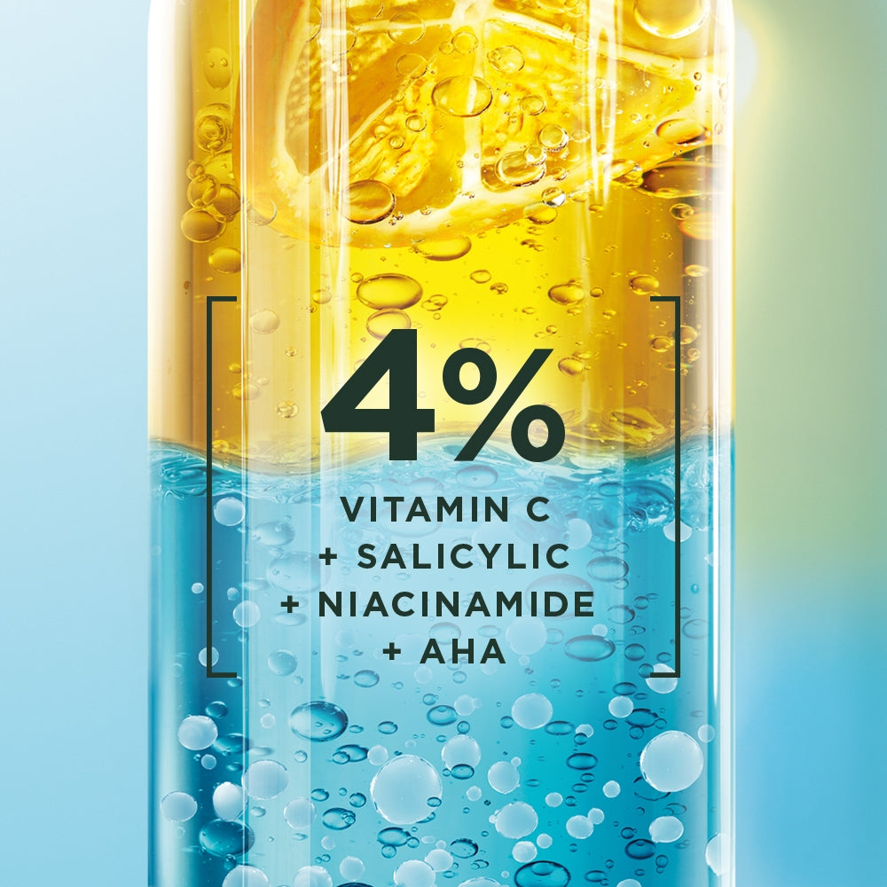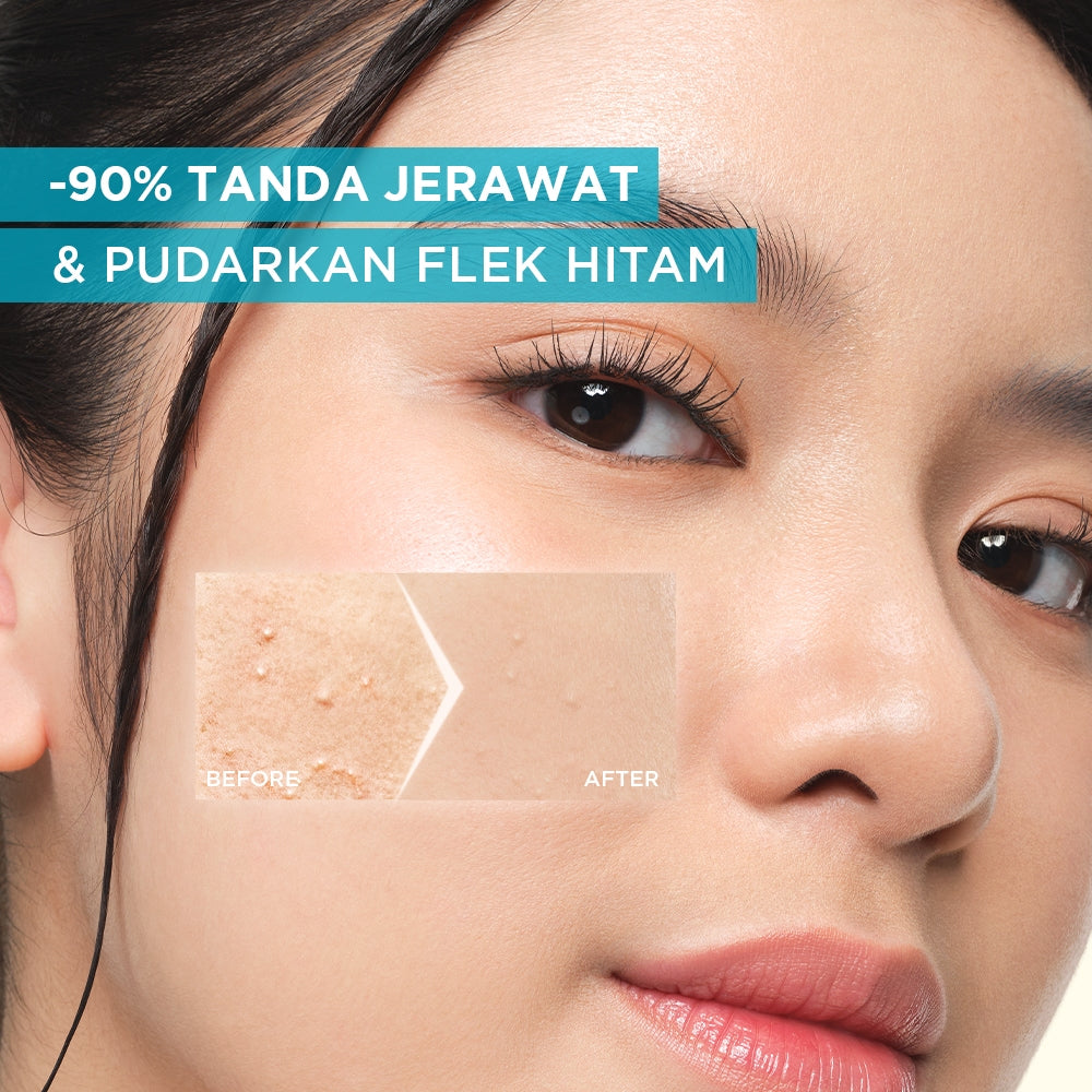 Telah teruji secara klinis dengan 4%* kombinasi dari Vitamin C yang dikenal dapat mencerahkan dan menyamarkan tampilan noda hitam + Salicylic Acid yang dapat melawan jerawat dan pori tersumbat + Niacinamide yang dikenal dapat menyejukkan kulit + AHA yang dapat menyamarkan noda jerawat, membuat kulit terasa lebih halus.