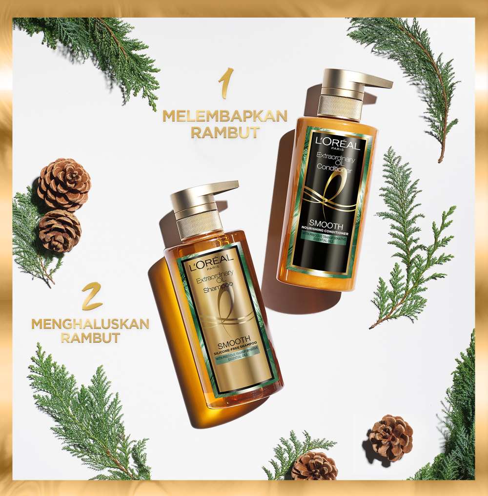 L'Oreal Paris Extraordinary Oil Smooth Shampoo & Conditioner diperkaya dengan Amber cedarwood essential oil membuat rambut +98% lebih halus & lembut sejak pemakaian pertama.