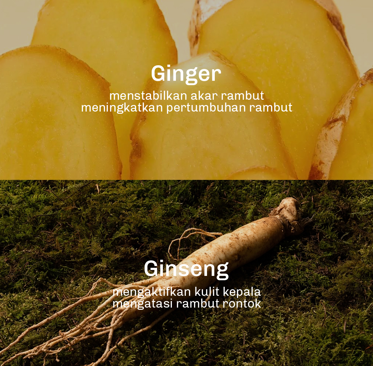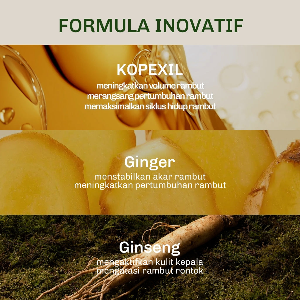 Ginseng, Jahe, Angelica, Daun Arborvitae - menstabilkan akar rambut dan meningkatkan metabolisme sel kulit kepala untuk mempercepat pertumbuhan rambut secara efektif
