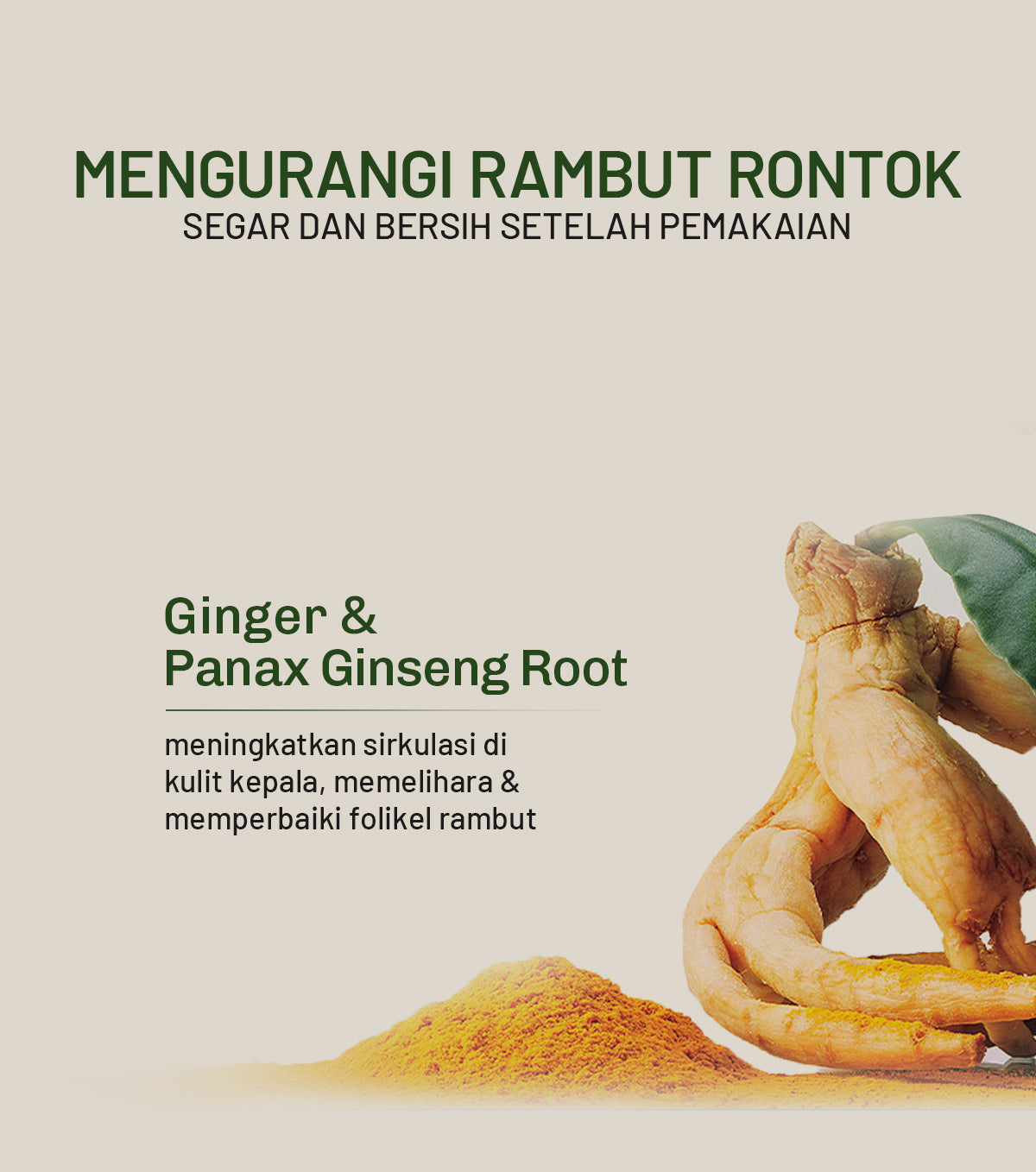 Ginseng, Jahe, Angelica, Daun Arborvitae - menstabilkan akar rambut dan meningkatkan metabolisme sel kulit kepala untuk mempercepat pertumbuhan rambut secara efektif