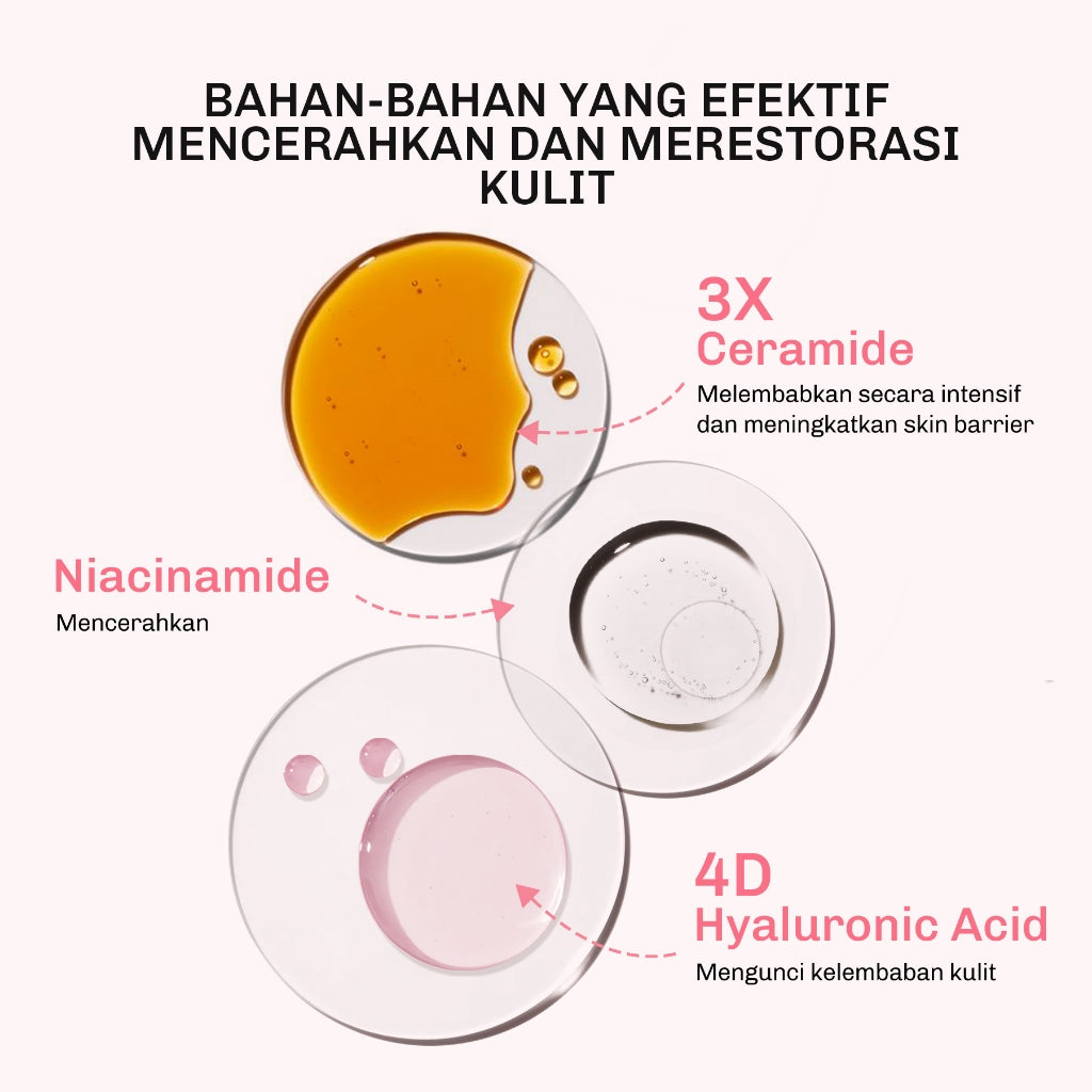 Diperkaya dengan Hyaluronic Acid dan Niacinamide untuk mencerahkan kulit dan menjaga kulit tetap terhidrasi.