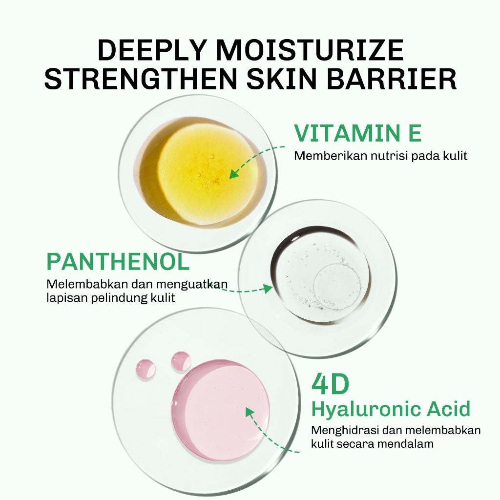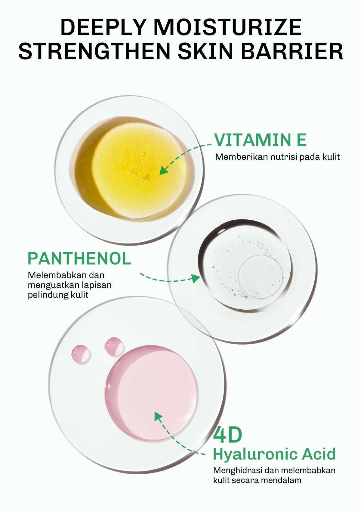 Kaya akan kelembapan dengan Panthenol, Vitamin E, Shea Butter, dan Allantoin untuk menciptakan formulasi yang mengatasi kekeringan, meningkatkan hidrasi, dan mendukung kesehatan kulit secara keseluruhan.