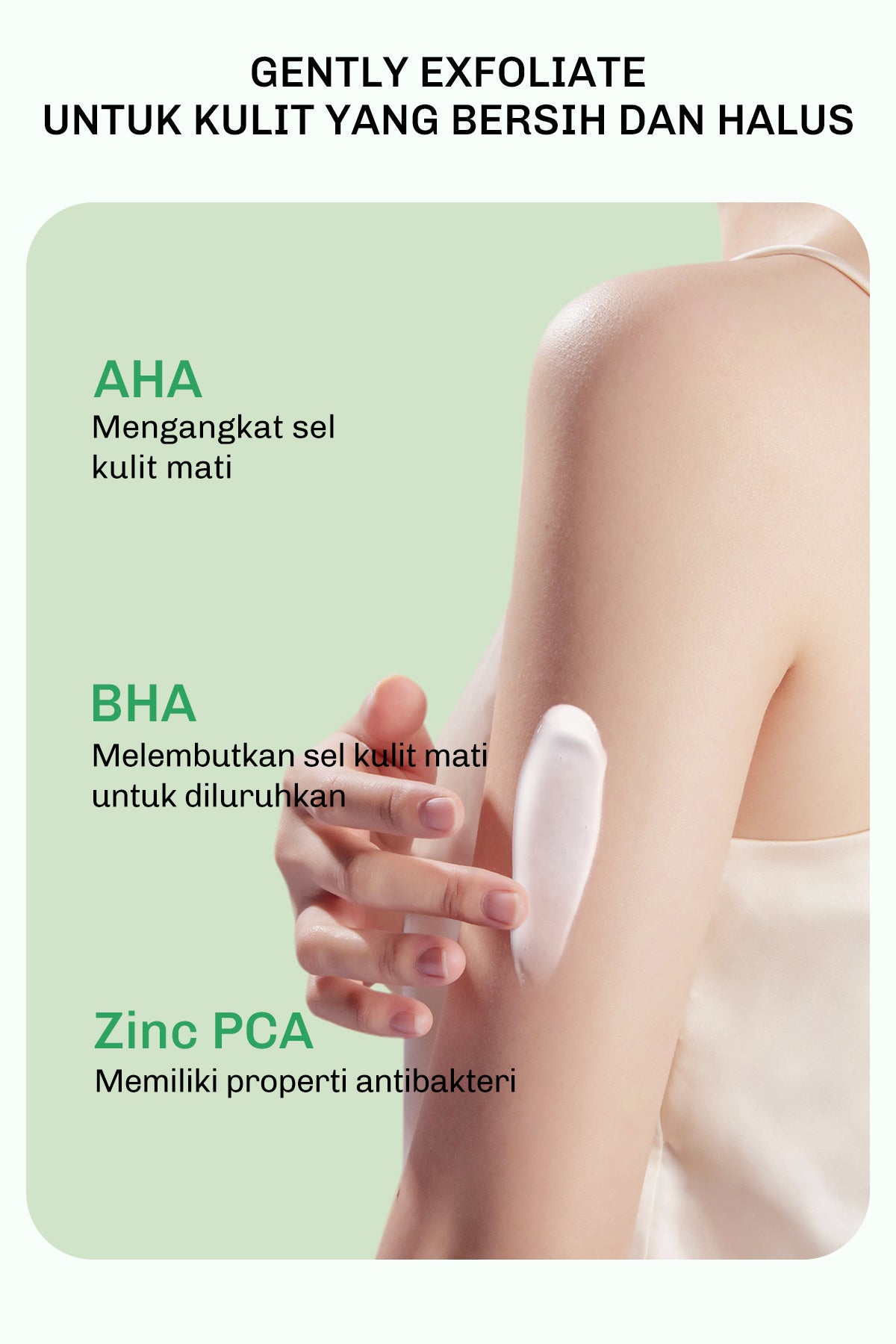 Diperkaya dengan Zinc PCA, AHA, BHA, dan 4 Jenis Botanical Essence untuk mengeksfoliasi kulit, mengangkat sel-sel mati, mengontrol minyak berlebih, dan menenangkan kulit.