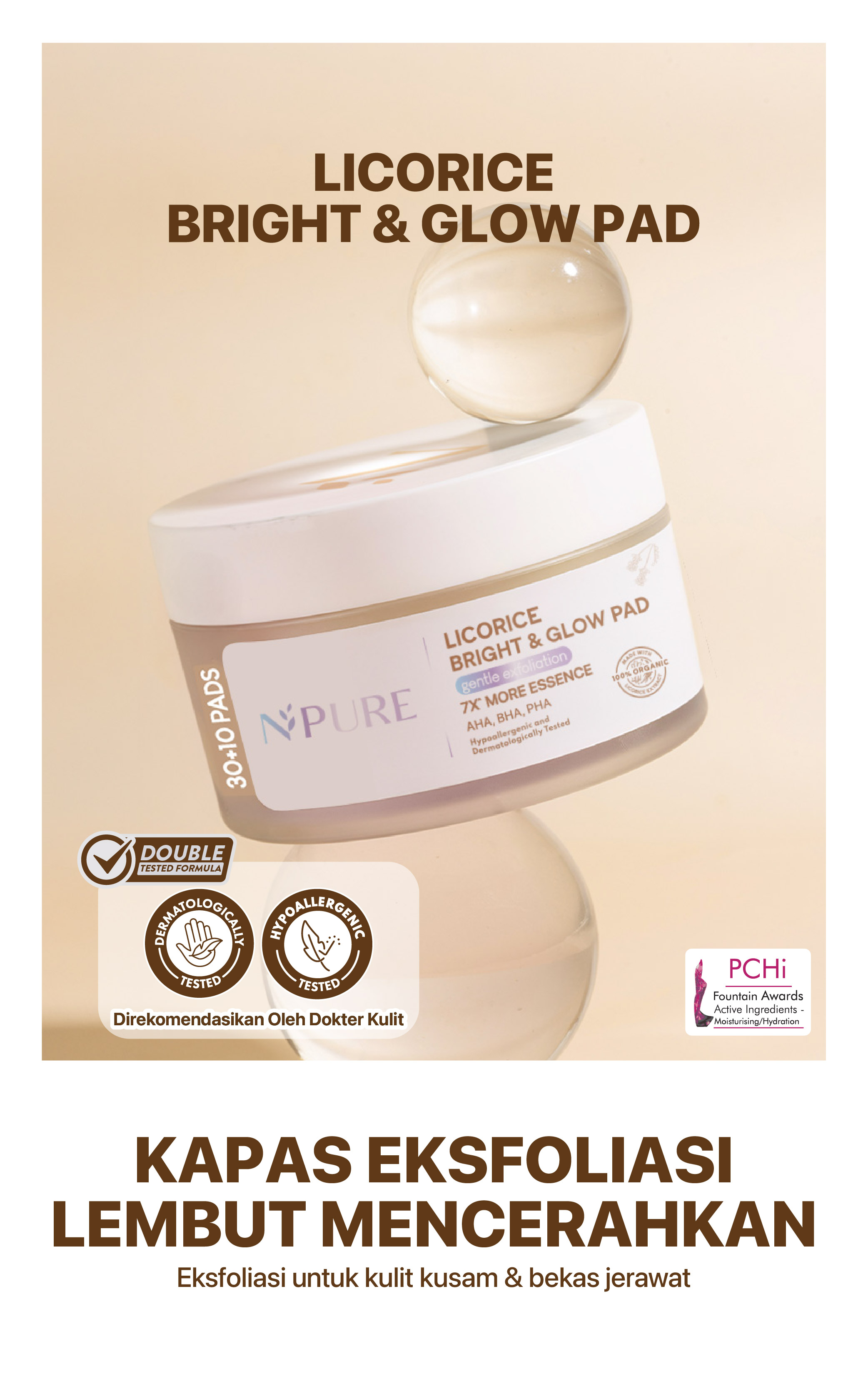 Setelah membersihkan wajah, usapkan NPURE Licorice Light Up Brightening Pad dengan lembut pada seluruh