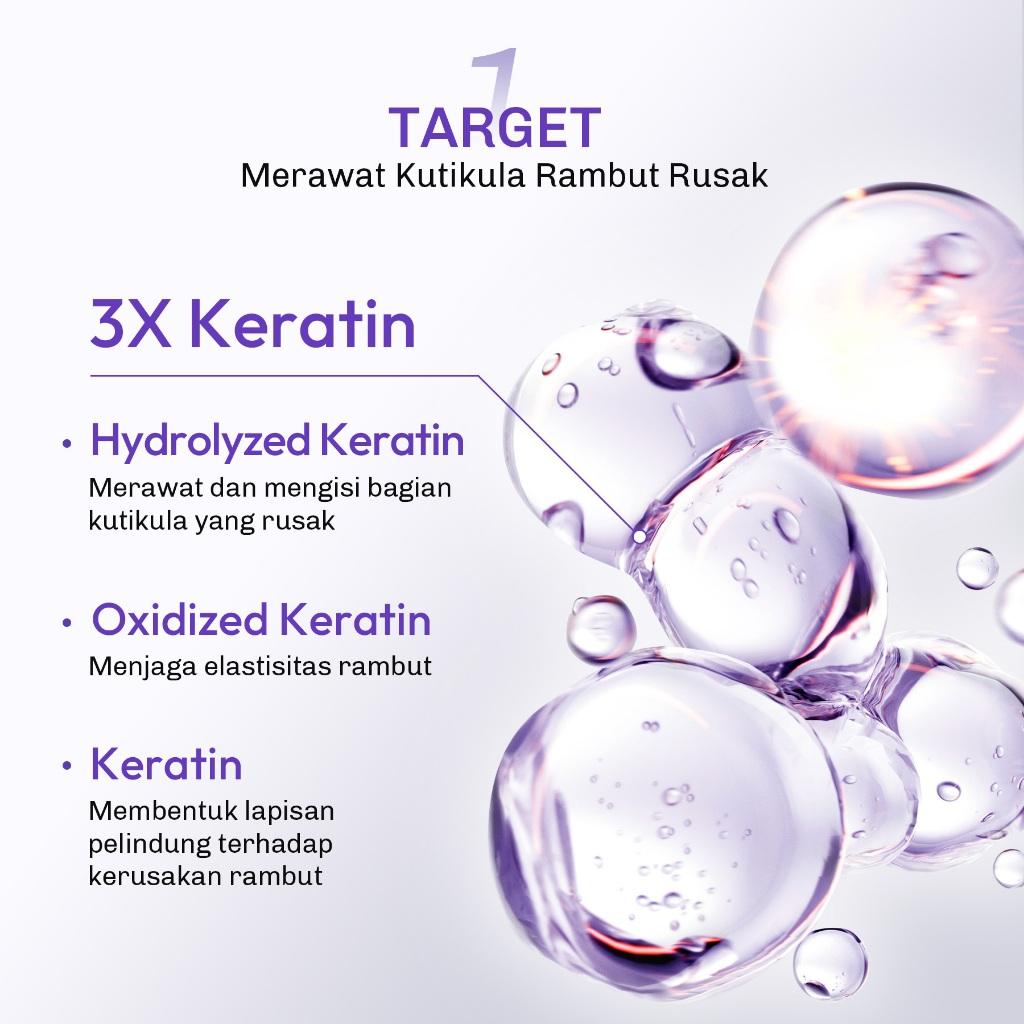 Kombinasi 3× Keratin, 3× Kolagen, dan 15× Asam Amino yang membantu memperbaiki tampilan rambut rusak dengan menghaluskan kutikula dan mengurangi rambut kusut. Diperkaya dengan Minyak Macadamia Australia dan silikon ringan untuk membuat rambut lembut, halus, dan mudah diatur tanpa rasa berat atau berminyak.