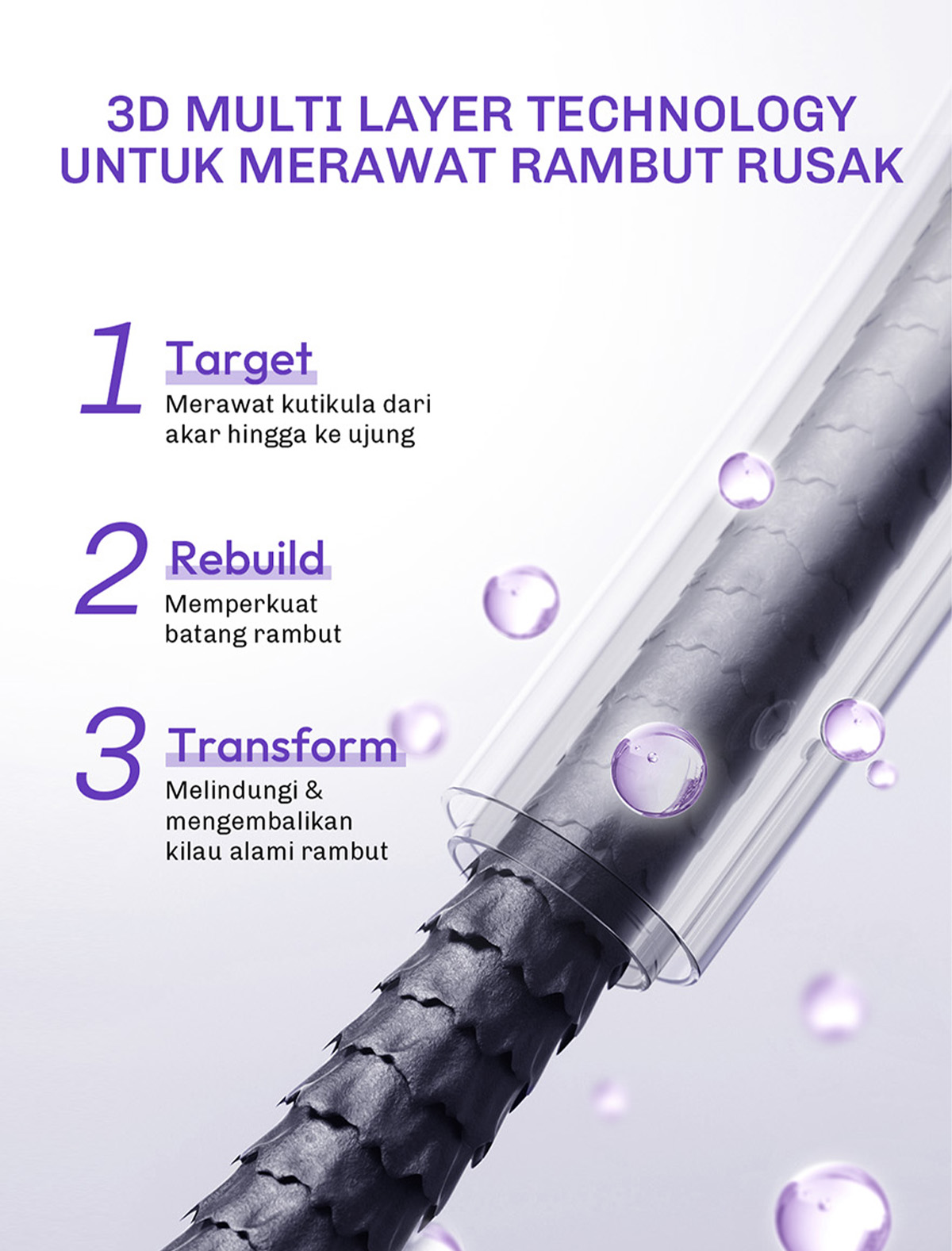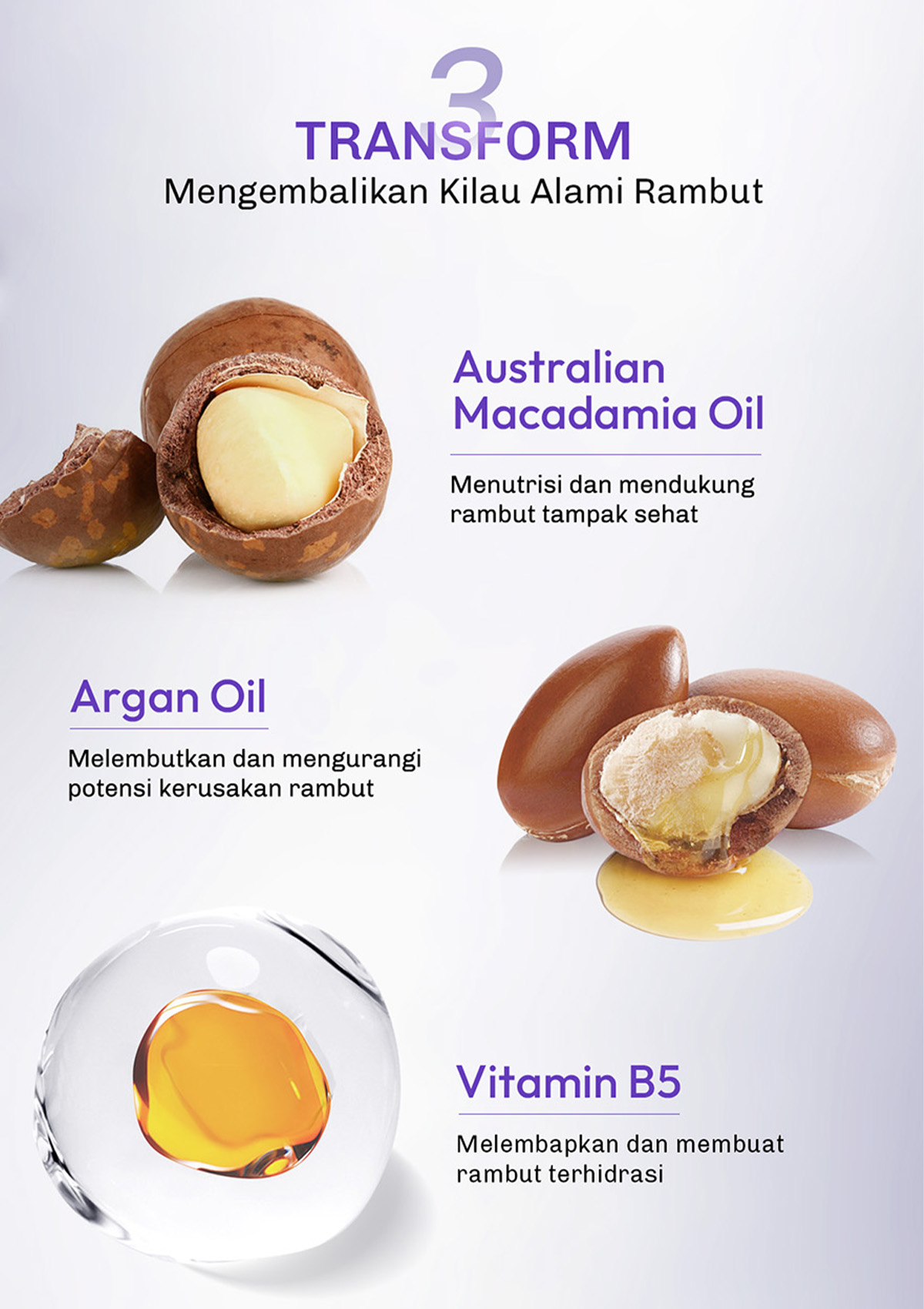 Kombinasi 3× Keratin, 3× Kolagen, dan 15× Asam Amino yang membantu memperbaiki tampilan rambut rusak dengan menghaluskan kutikula dan mengurangi rambut kusut. Diperkaya dengan Minyak Macadamia Australia dan silikon ringan untuk membuat rambut lembut, halus, dan mudah diatur tanpa rasa berat atau berminyak.