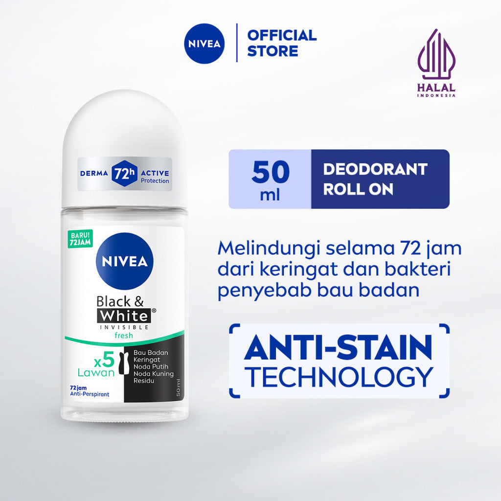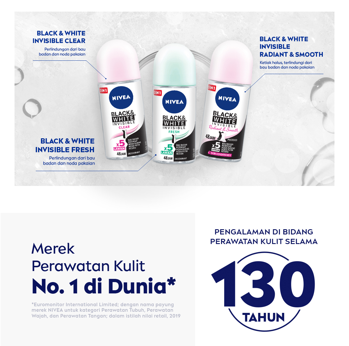 NIVEA Deodorant Roll On Black & White Invisible Fresh 50ml - Deodoran wanita melawan bau badan tahan keringat anti noda residu dengan wangi segar tahan lama seharian - Antiperspiran, tidak mengandung ethyl alkohol cocok semua jenis kulit