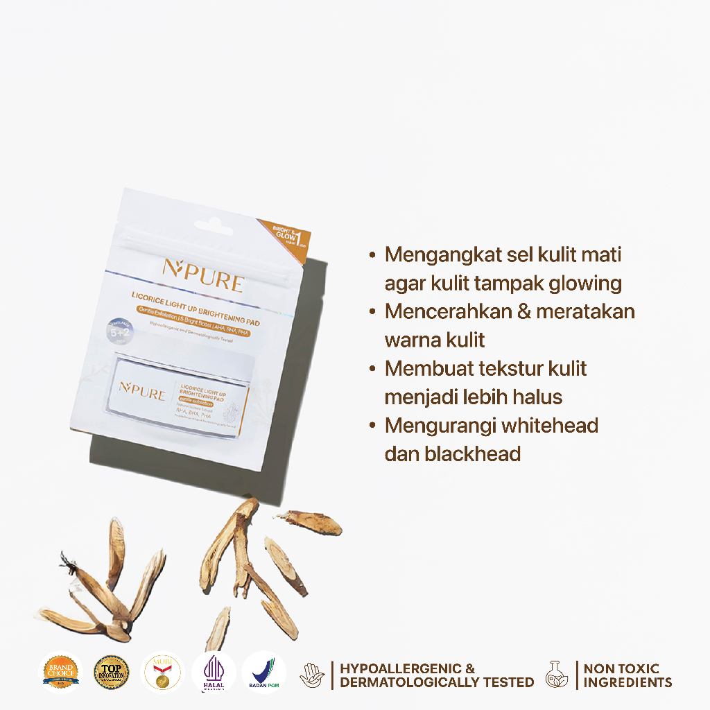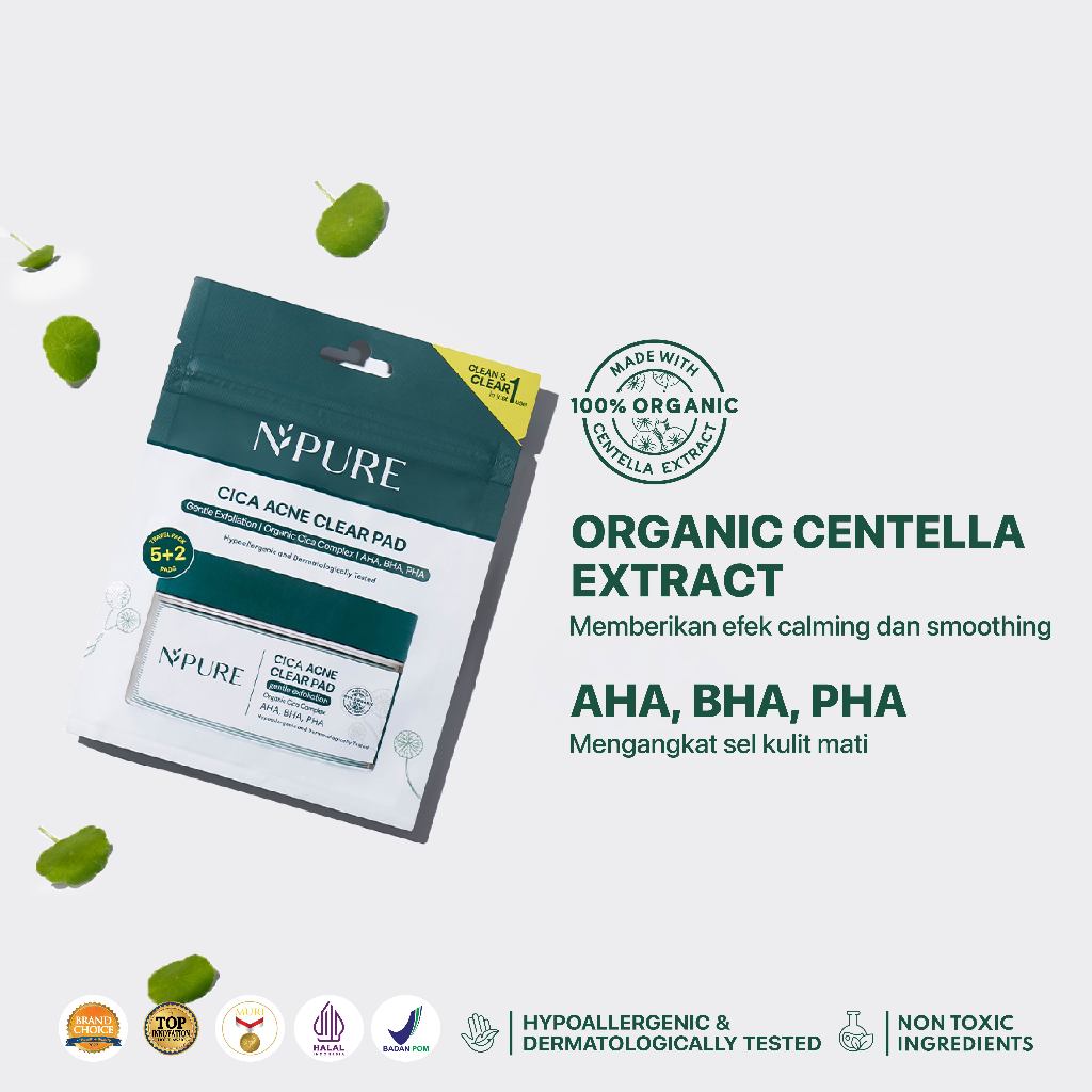 ● AHA, BHA, PHA, mengangkat sel kulit mati sehingga wajah menjadi lebih cerah dan warna kulit merata Cara Pakai: Setelah membersihkan wajah, usapkan NPURE Cica Clear Pad dengan lembut pada seluruh wajah dan leher dengan menghindari area mata. Tidak perlu dibilas. Lanjutkan dengan rutinitas skincare harian kamu. Gunakan 2-3x seminggu. BPOM, Halal, Dermatologically Tested, pH Balance, Fragrance Free, Alcohol Free, Paraben Free, SLS Free, SIlicone Free, Bumil & Busui Friendly, No Animal Testing, EU Alergen Free, Minimal Ingredients.