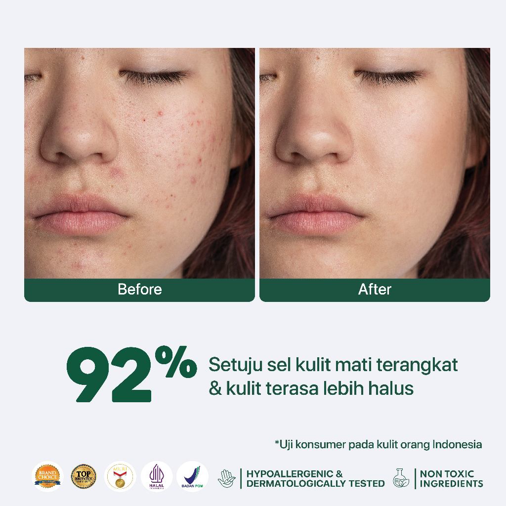 Fungsi 2in1: Physical & Chemical Exfoliator Gentle exfoliation, strong result Aman untuk eksfoliasi kulit berjerawat & sensitif Kapas eksfoliasi lembut yang mudah digunakan, berfungsi untuk membersihkan sel kulit mati secara efektif, mengatasi permasalahan kulit kusam, dan menjadikan kulit lebih halus. Kandungan eksfoliasi yang lembut dan diperkaya dengan anti iritasi membantu untuk menenangkan kulit, sehingga aman untuk semua jenis kulit, bahkan kulit berjerawat dan sensitif.