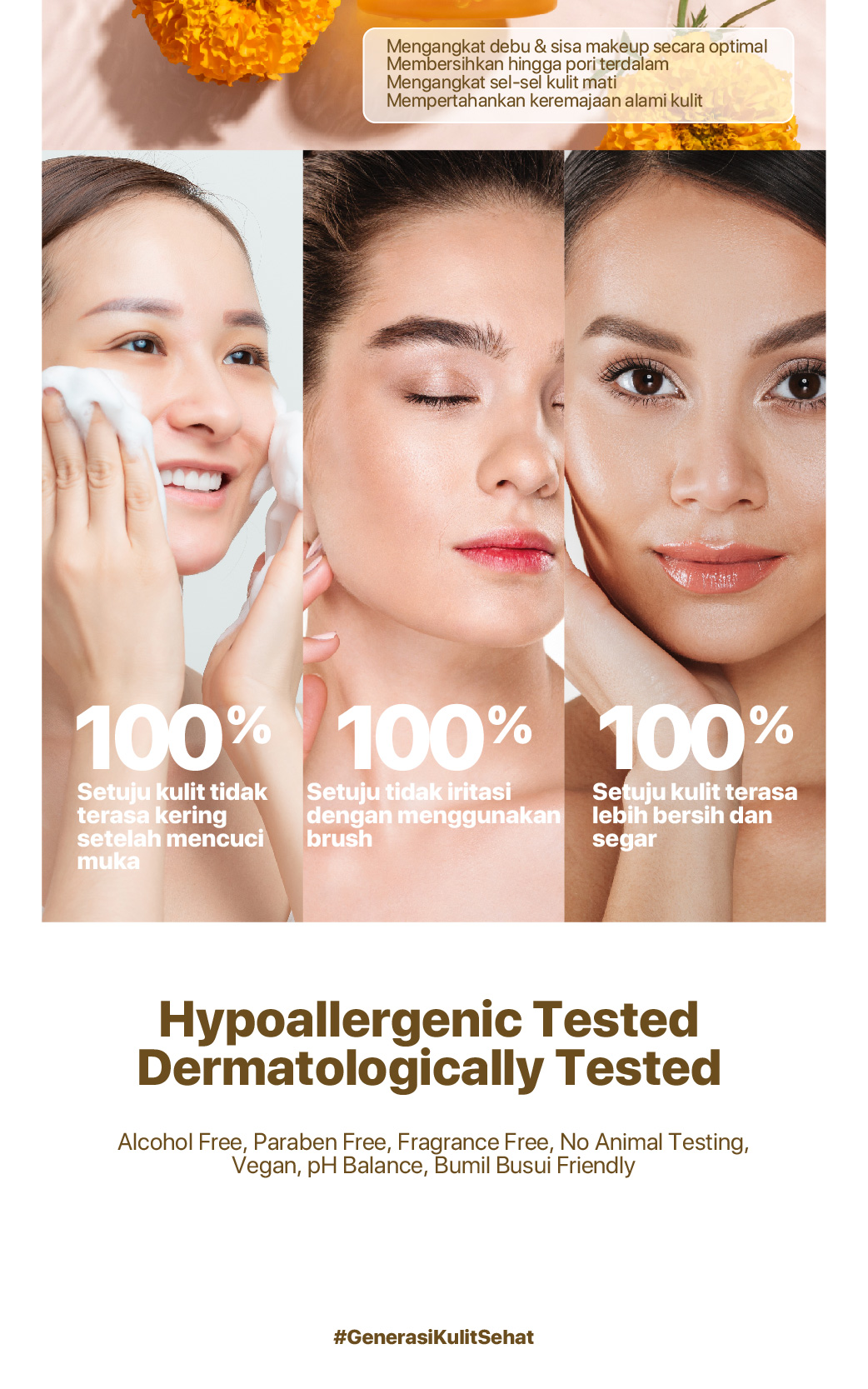 Marigold dan 8X Essential Vitamins yang dapat membersihkan kulit dari polusi debu dan kotoran. Diperkaya