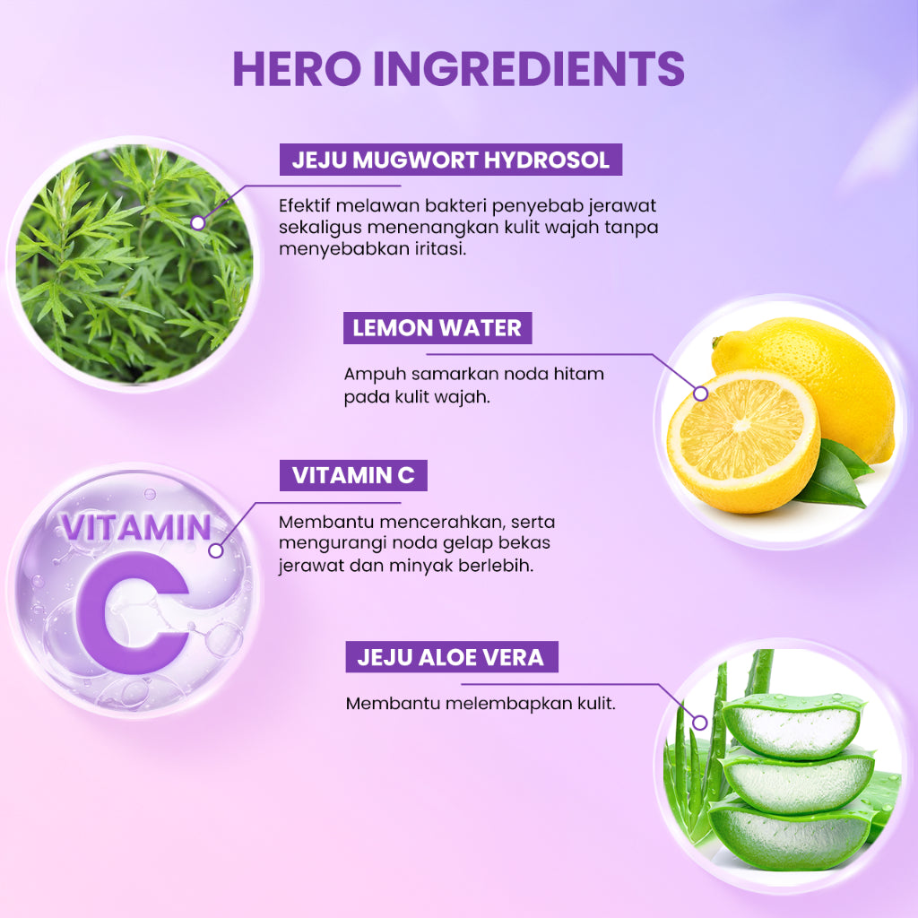 • Mugwort Hydrosol yang efektif melawan bakteri penyebab jerawat sekaligus menenangkan, dengan Triple Action Mugwort Hydrosol + Tea Tree Water + Salicylic Acid