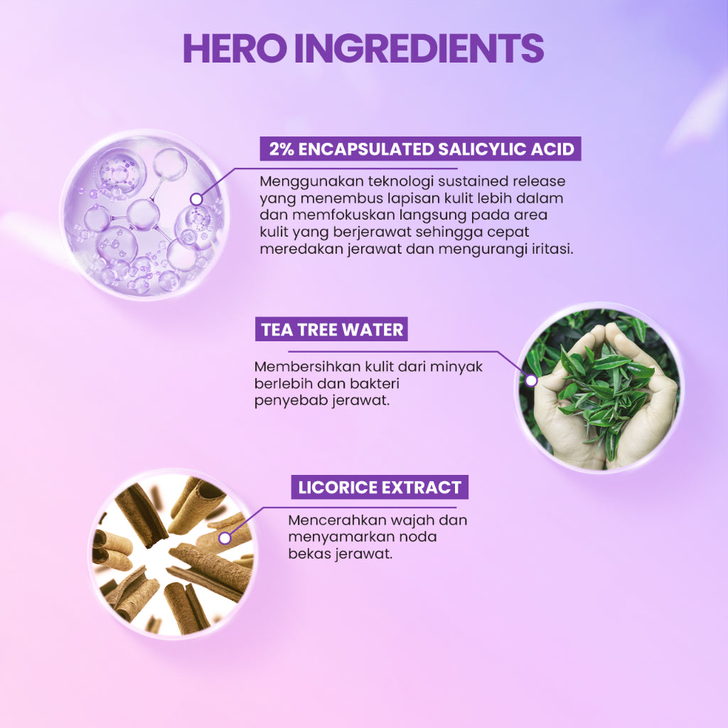 • 2% Encapsulated Salicylic Acid dengan teknologi sustained release yang fokus bekerja di area kulit berjerawat tanpa membuat iritasi area lainnya