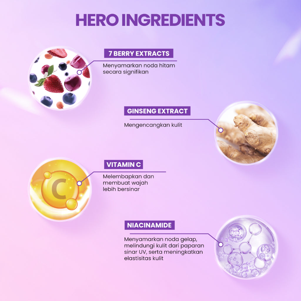 • 7 Berry Extract sebagai antioksidan alami yang menghidrasi dan mencerahkan kulit