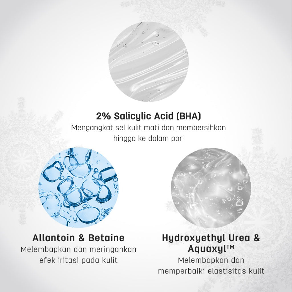 * Salicylic Acid (BHA) : Mengangkat kotoran dan berpenetrasi ke dalam pori lebih baik daripada physical exfoliator. Aman untuk kulit sensitif dan tidak membuat kulit kering.