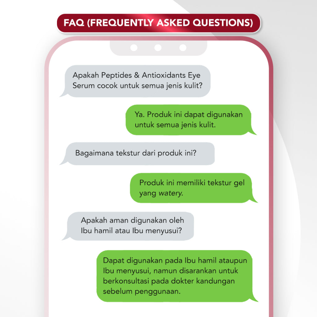 Serum khusus yang dapat melembapkan area kulit mata. Dengan kandungan Peptides & Antioxidants membantu menyamarkan garis halus dan lingkaran hitam bawah mata dalam 4 minggu*. Kulit area mata tampak lebih sehat dan kencang.