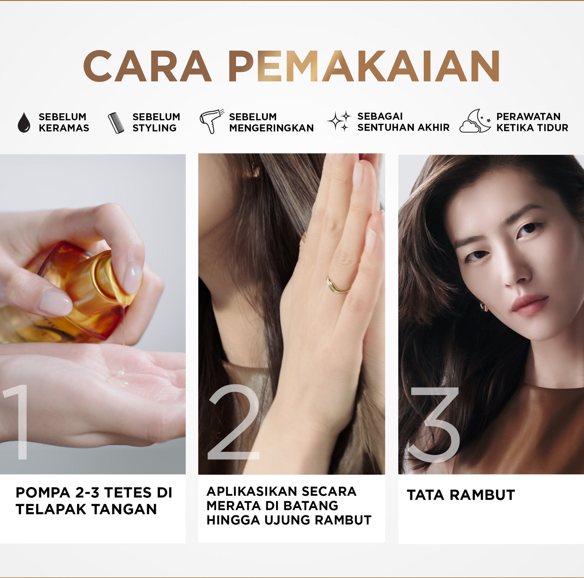• Agar nutrisi dan hasil maksimal, gunakan juga sampo dan conditioner sesuai dengan rangkaian Extraordinary Oil Gold